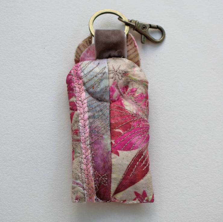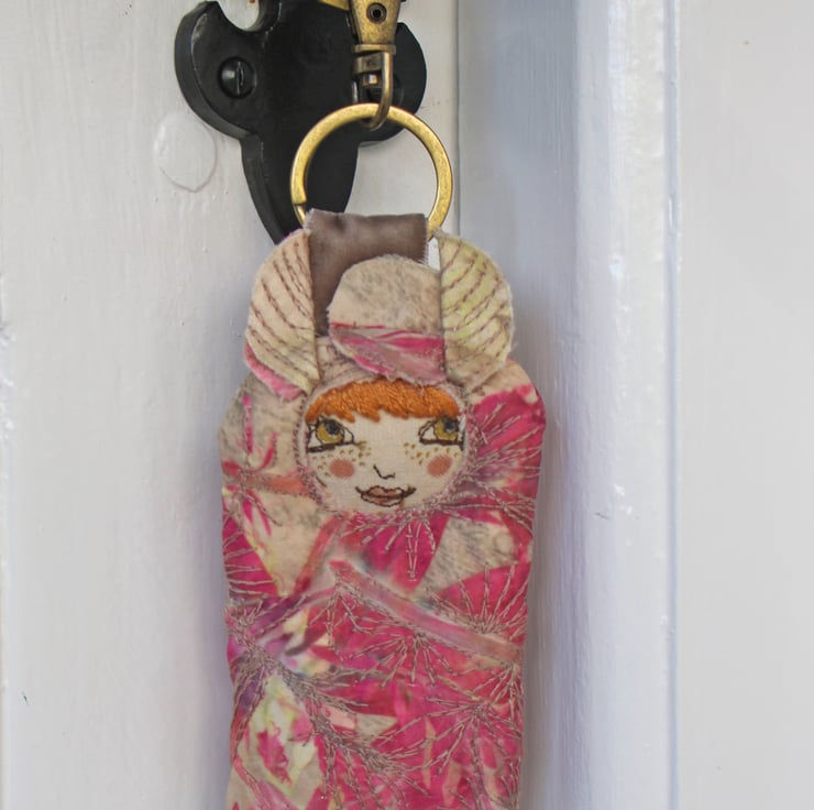Dora, part of my 'Woodland Folk' collection, is made from an original heat reactive dye printed piece of cloth, enhanced with free motion and hand embroidery and finished with a metal loop and lobster clasp. Dora looks equally at home just hanging around on a door, but also makes a whimsical yet practical bag decoration.