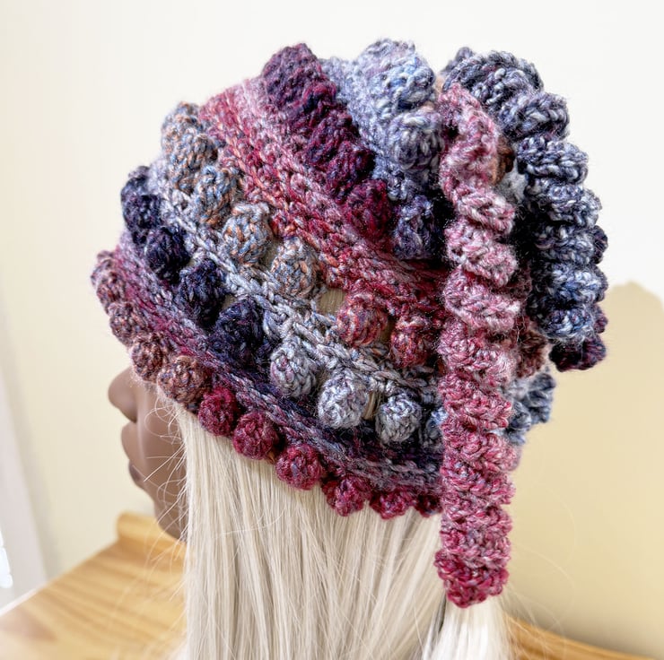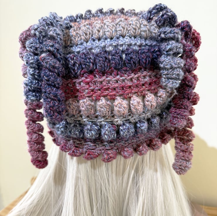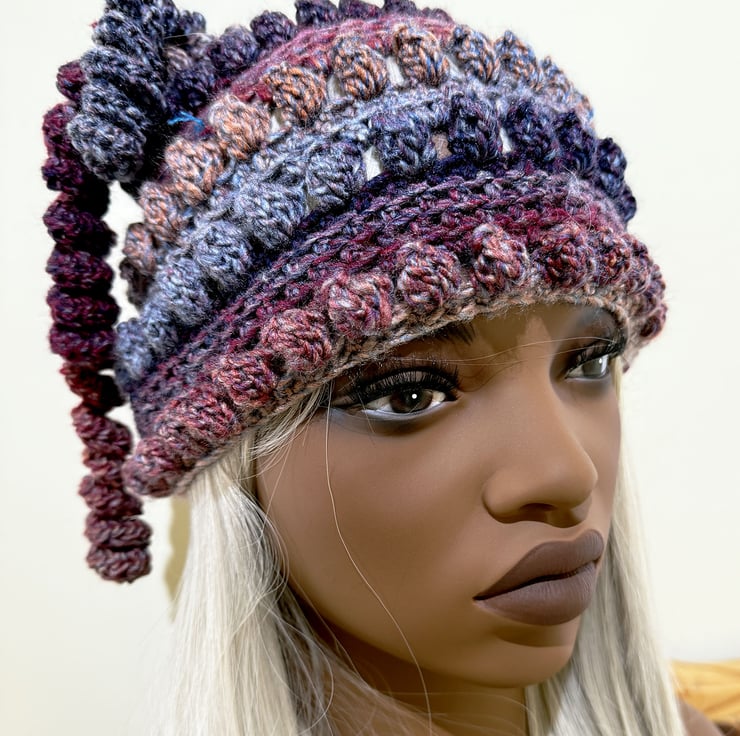 Super warm and soft funky beanie hat with curly tassels in machine washable acrylic yarn in earthy heather shades of purple, grey, blue and pink.