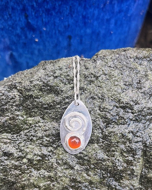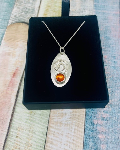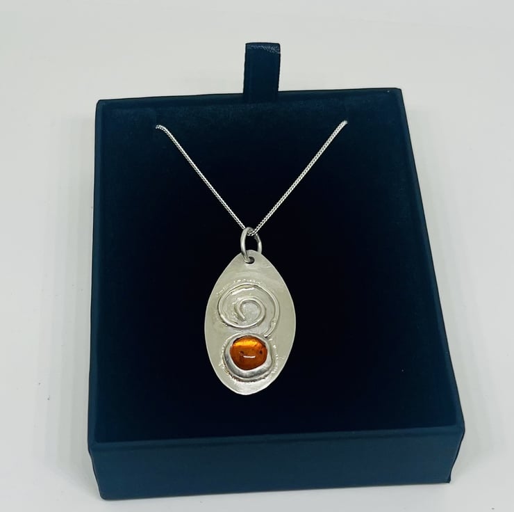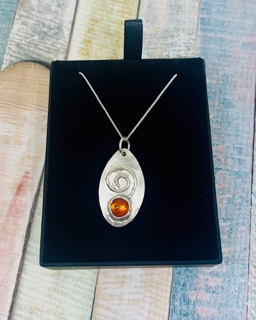A beautiful handmade pendant necklace, made from recycled solid sterling silver 925 and featuring a gorgeous round Amber gemstone. It also has a silver spiral but it's listed at a discounted price as it's perfectly imperfect because it was one of my early attempts at soldering silver wire, so it’s not as tidy as I’d like! (you can see the shadow where the solder has flowed). But it’s still one of a kind, and the Amber is so beautiful with the spiral! So hoping it will find someone to love it. It hangs on an 18” diamond cut curb chain made of sterling silver 925.