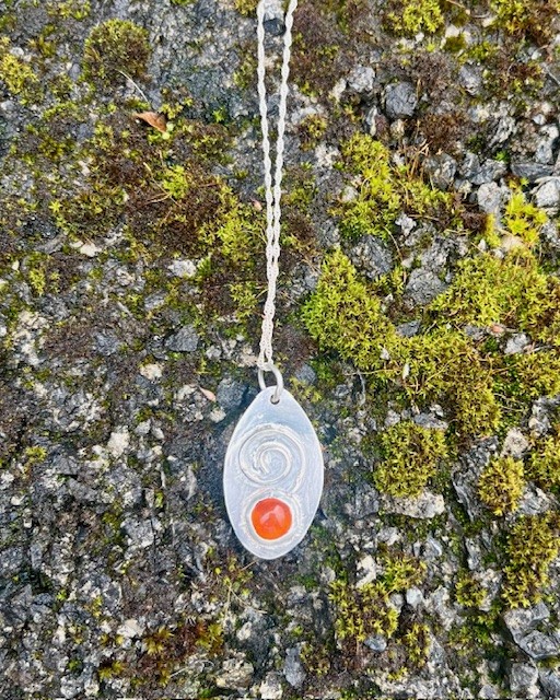I wanted to practice soldering wire in shapes to silver sheet, and I love spirals! It complements the beautiful amber cabochon gemstone.