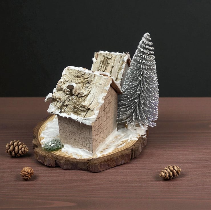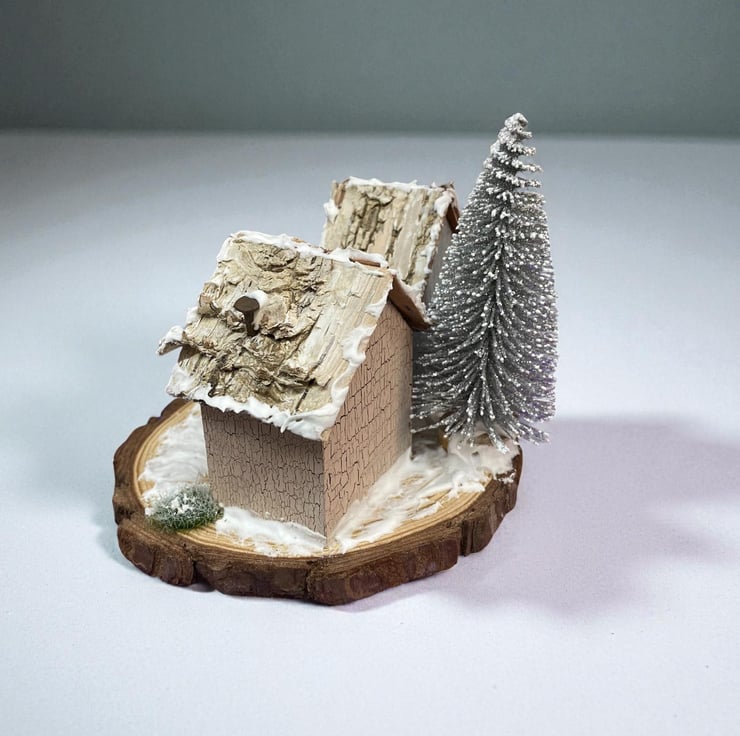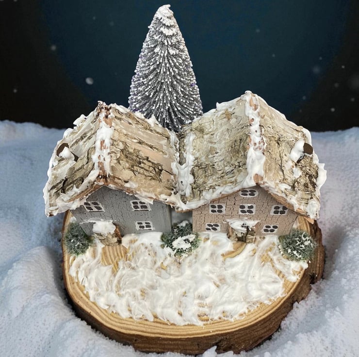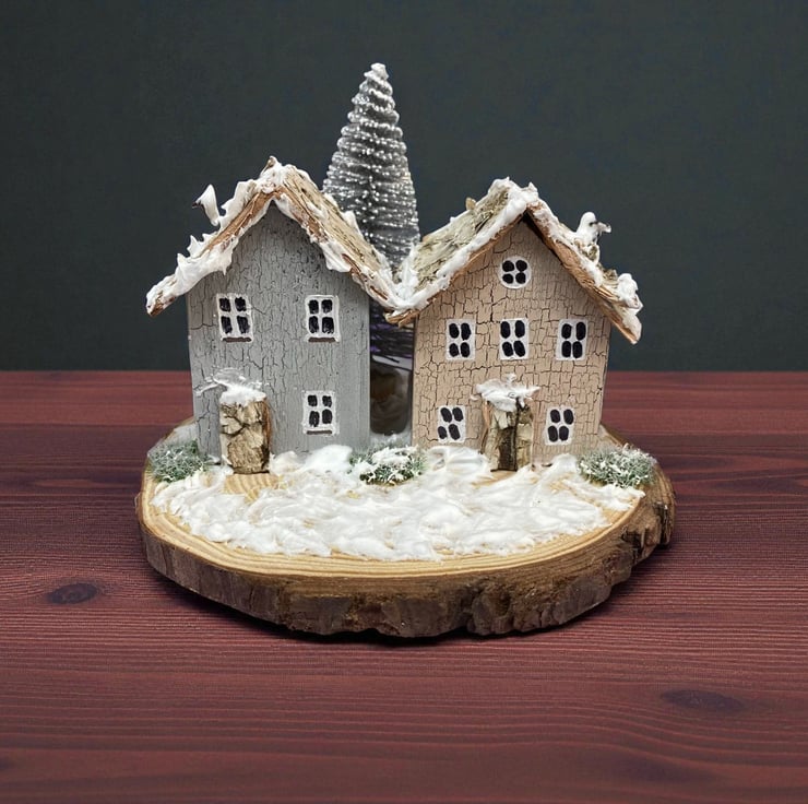A handcrafted winter village featuring two wooden cottages with snow-covered roofs and a frosted tree. Each house is painted in soft, muted tones with a crackle finish to give a weathered, rustic look. The scene is set on a natural wood slice base with added snow and greenery for a realistic finish.