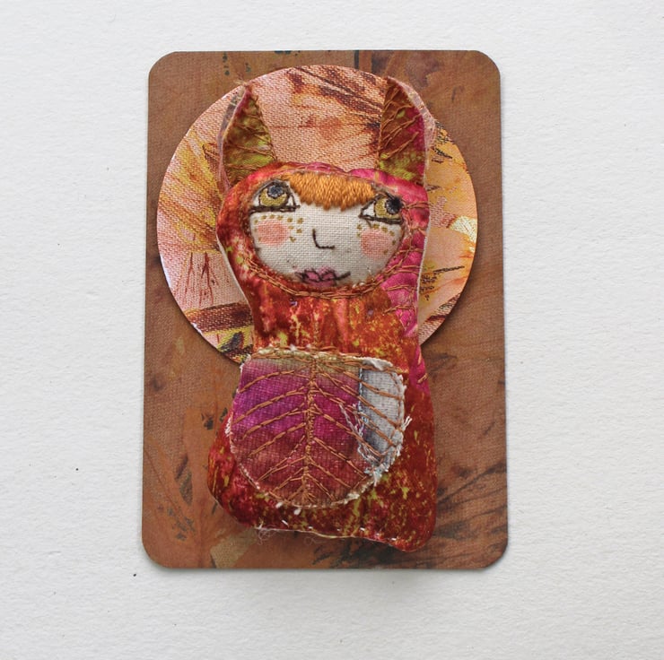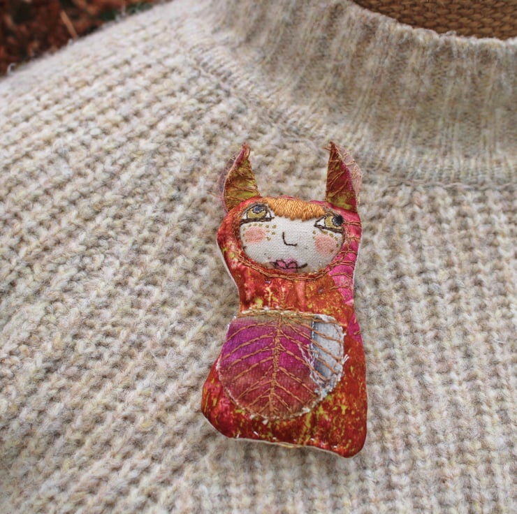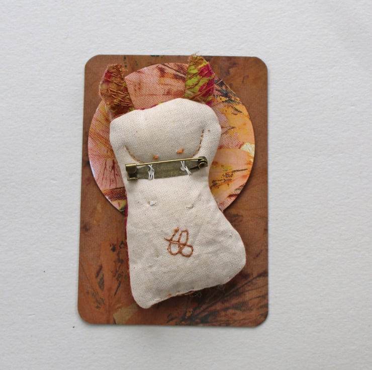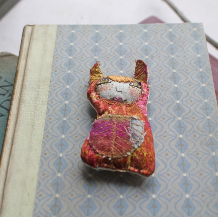 Cat, part of my 'Woodland Folk' collection, is made out of an original heat reactive dye printed piece of cloth, enhanced with free motion and hand embroidery, backed in calico and finished with a metal clasp. Cat looks fabulous worn as a brooch on chunky knits or a jacket, but also makes a whimsical wall or home decoration.