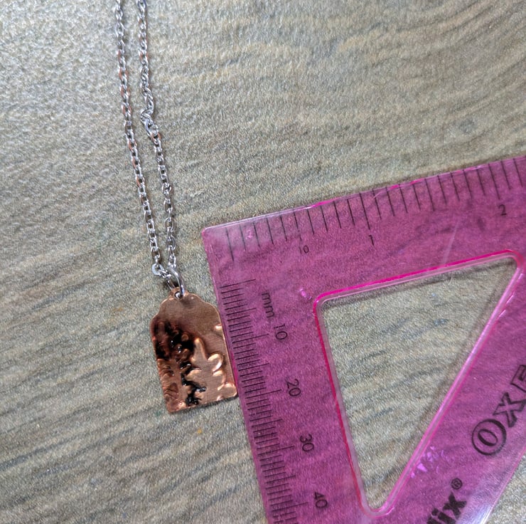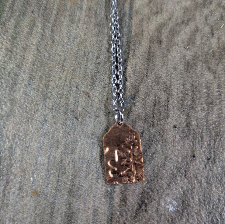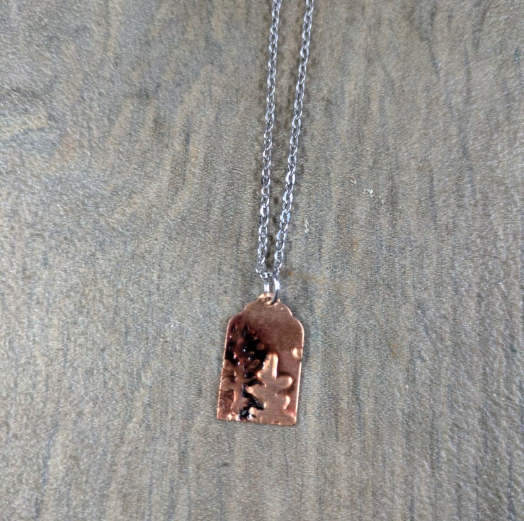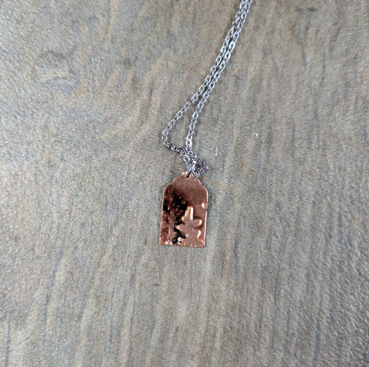 45cm stainless steel necklace with lobster clasp. Embossed and hand coloured copper pendant attached. This has been coloured on one side, with the reverse plain embossed copper. The pendant is a tag shape approx 2cm long, decorated with an abstract leaf design.