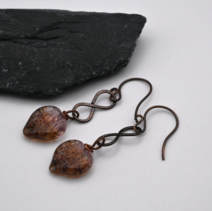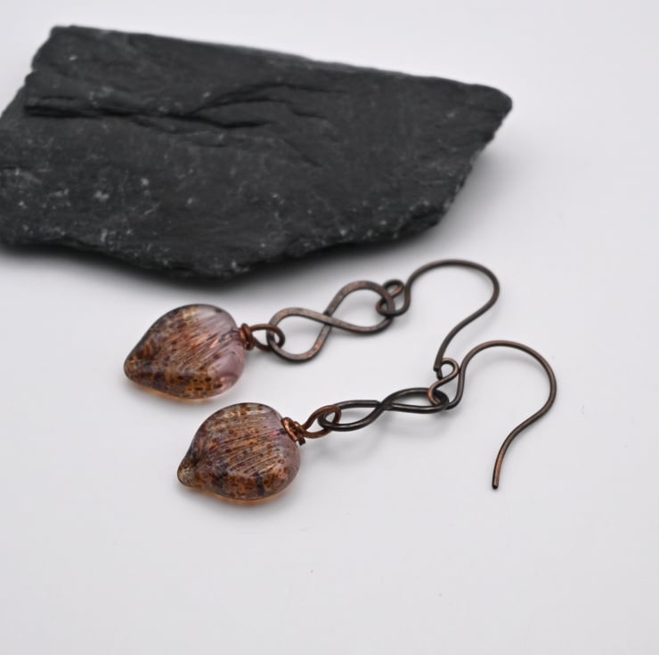 A pair of copper earrings which feature handmade copper link connectors and handmade lampwork glass leaf charms.