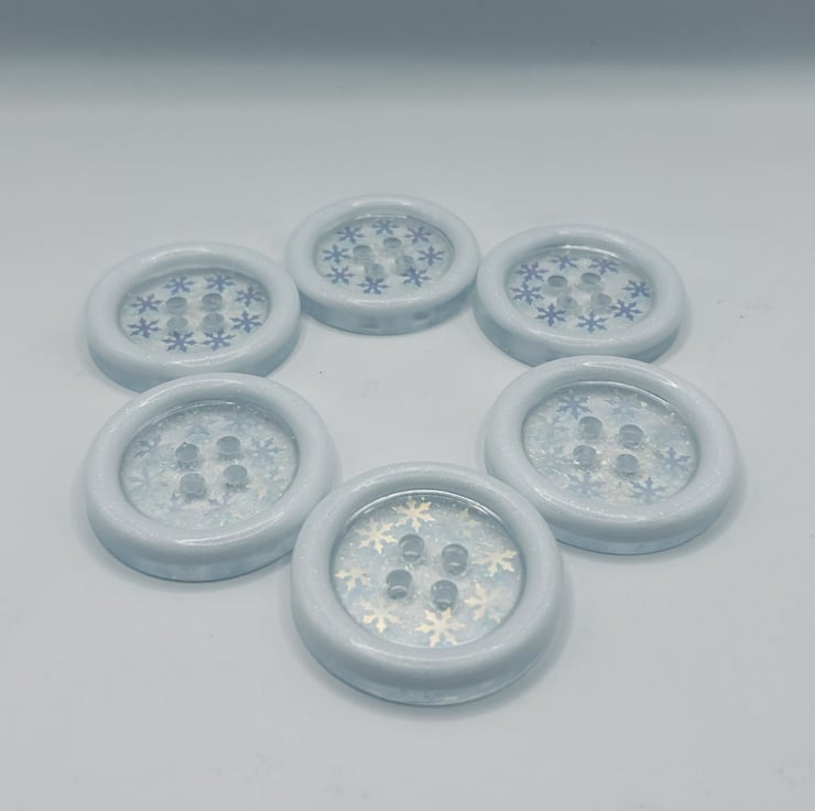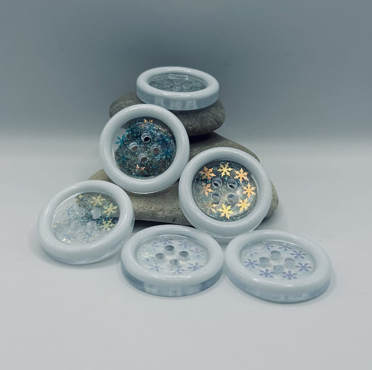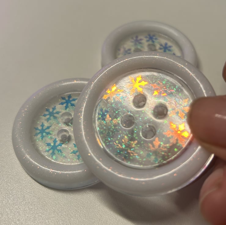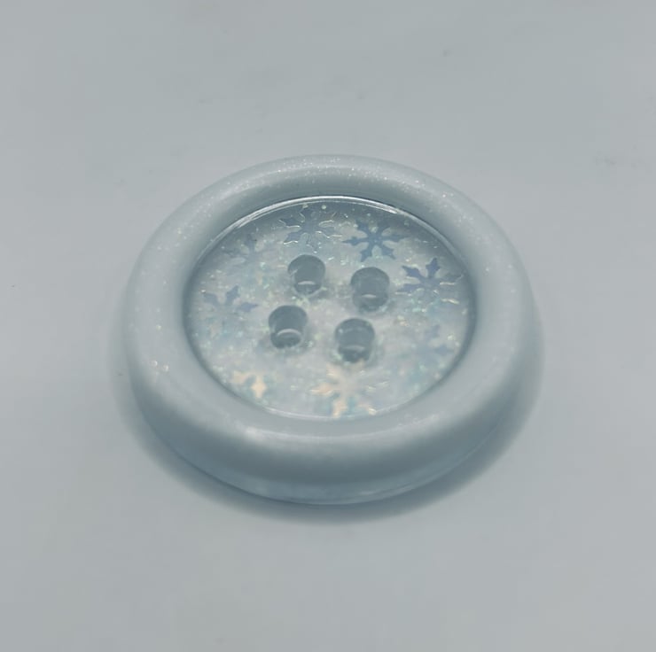 Handmade giant 50mm resin button featuring a circle of iridescent snowflakes suspended in clear, glittery resin with a sparkling white centre. The snowflakes shift in colour from a cool blue to a warm gold, depending on the lighting and angle. Each button has four central holes and a chunky, eye-catching design. These are true statement pieces - perfect for adding a touch of winter magic and sparkle to any garment or craft project. Ideal for the festive season, crafters, knitters, crocheters or for anyone who loves a winter wonderland vibe.
