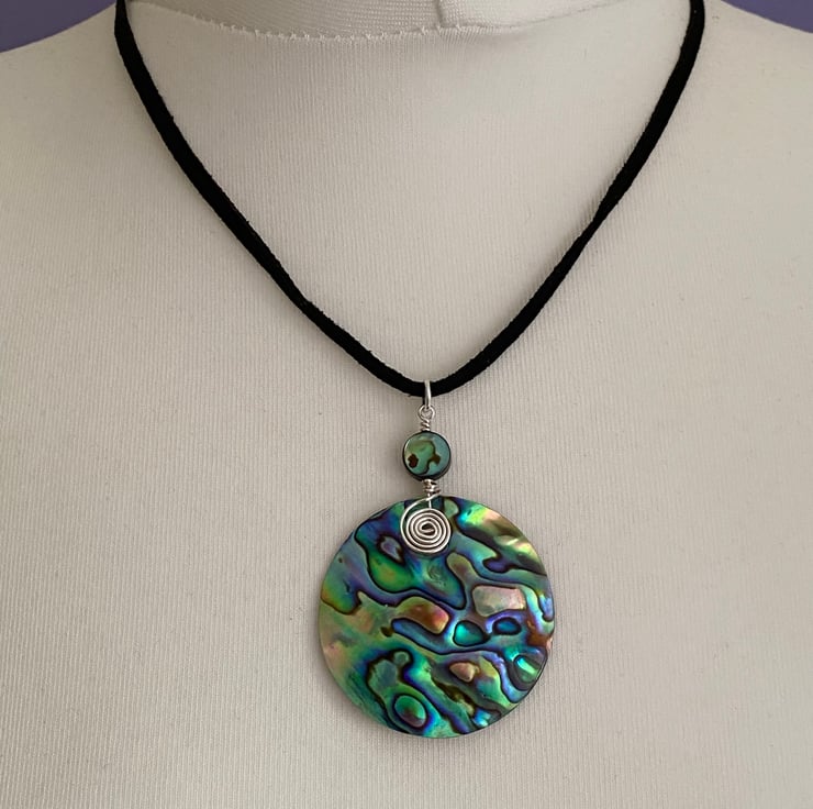 Here I've placed this natural abalone shell pendant onto black faux suede cord along with a small round abalone stone and silver plated wirework spiral. There's another tiny spiral at the end of the extender chain, topped with a tiny faceted black spinel stone.