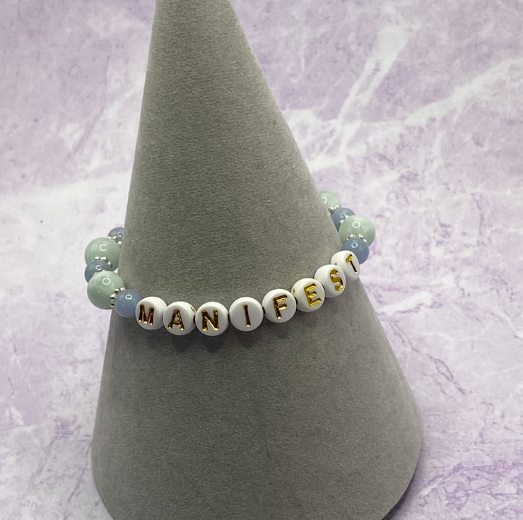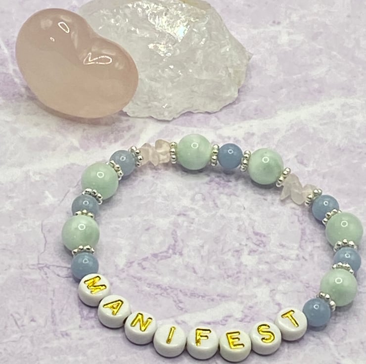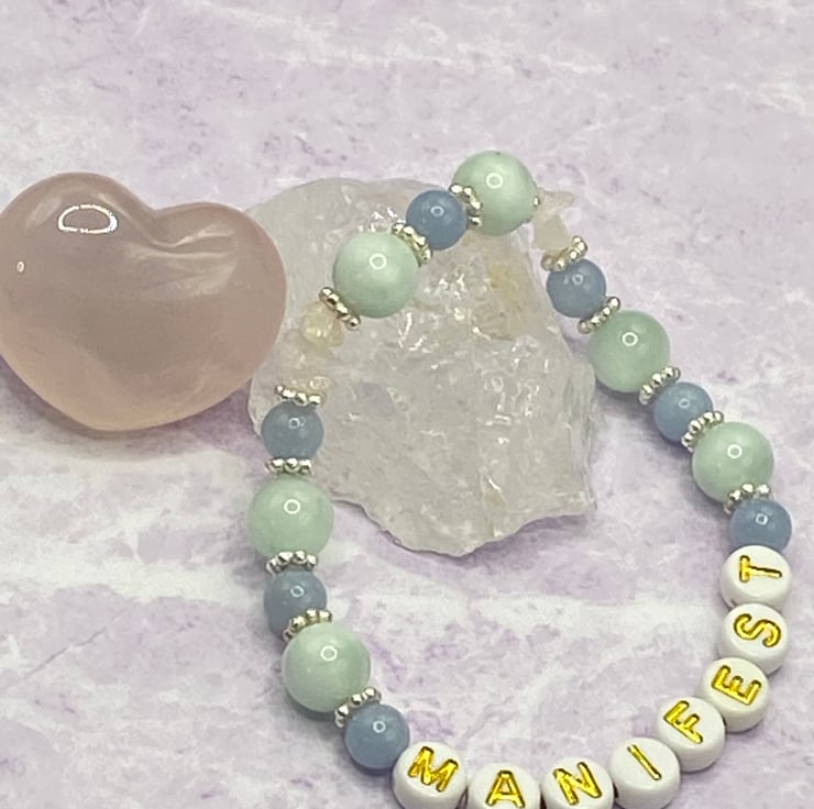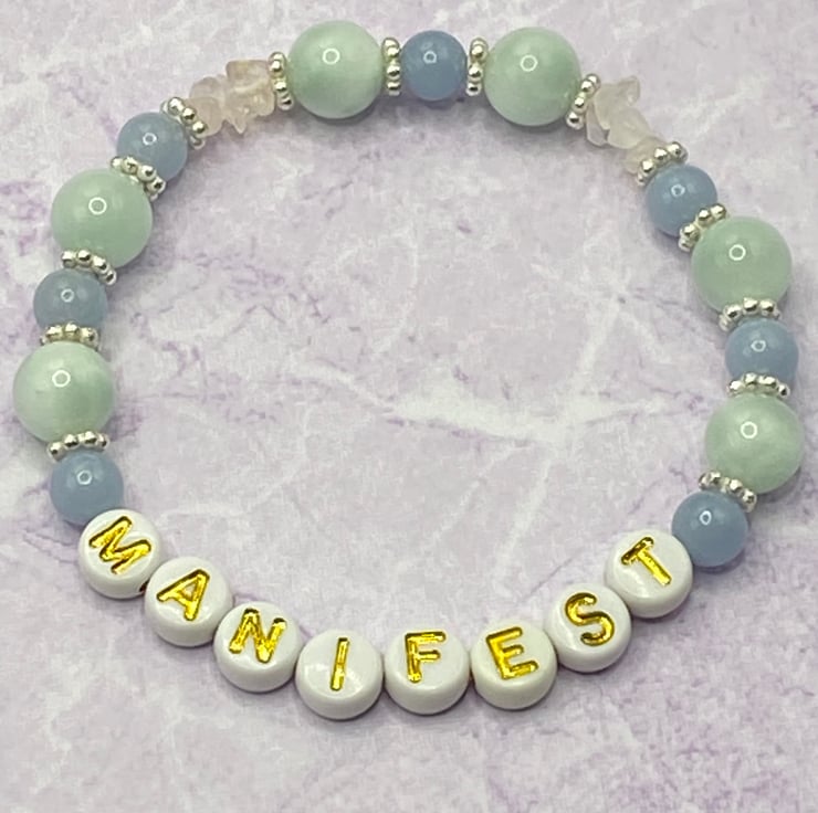 A stretchy gemstone bracelet with the word 'Manifest' spelt out in white and gold acrylic letter beads. Surrounding the word in beautiful pastel colours are 6mm blue angelite and 8mm green angelite stones that are interspersed with silver plated flower shaped spacers and a sprinkling of small rose quartz nuggets.