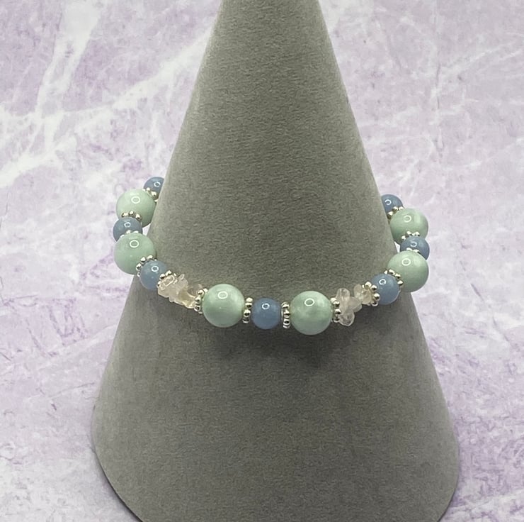 Angelite was only discovered in 1989 and is more commonly found in shades of pale blue (also known as blue anhydrite) but occasionally the presence of chromium in its chemical composition creates more of a pale green. Originally discovered in Peru, the stone has now been found in other locations worldwide including the UK, although both types used in this bracelet are from Brazil. It is often thought to be a high vibrational stone which helps understand the meanings of dreams.