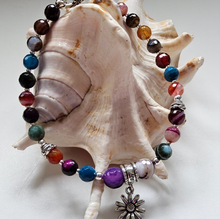 The smaller faceted agate gemstones rounds are 7mm with two larger faceted centre stones measuring 10mm rounds. In the centre is a silver plated daisy flowers charm with the word love on the barrel bail. Two further tibetan style bead caps with 3mm silver plated beads add additional interest and sparkle with 2mm silver plated beads between the gemstones.