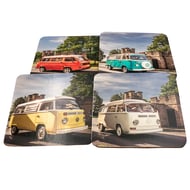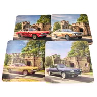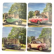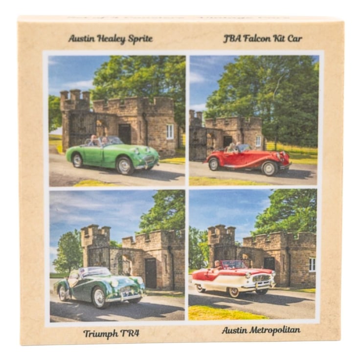 Square Coasters with a cork backing on 2mm Plywood featuring original photographs of Vintage Cars. This listing is for 4 open top cars (Austin Healey Sprite, JBA Falcon, Triumph TR4 and Austin Metropolitan)