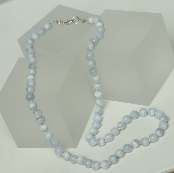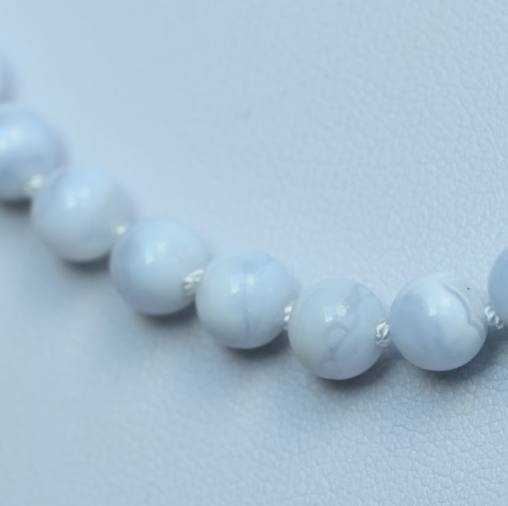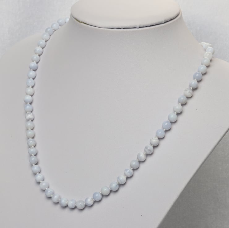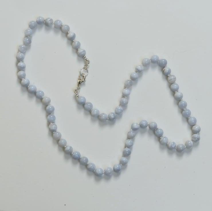 A dainty necklace made from 6mm Blue Lace Agate Beads with sterling silver fittings. Blue Lace Agate is considered by some to be a calming and stress relieving stone. The colour of these stones are a very pale blue and white. I have strung the beads on high performance nylon in the same way that I string freshwater pearls: with a tiny knot between each bead. This gives the piece a good drape and also reduces the risk of losing all your beads in the unlikely event of the thread breaking.