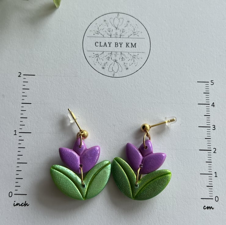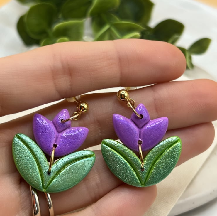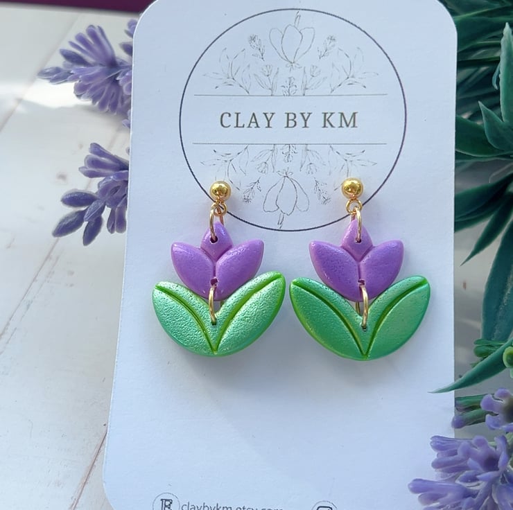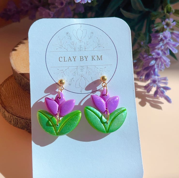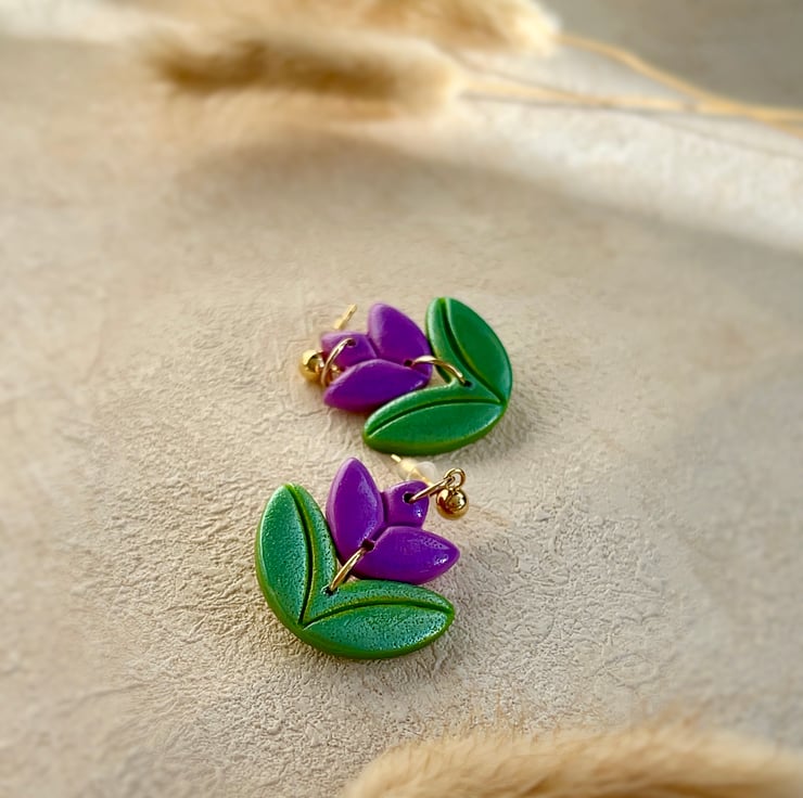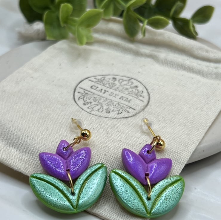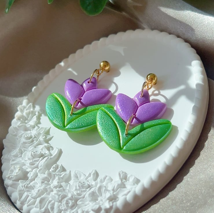 Purple tulip polymer clay earrings for her, Floral jewellery for spring lovers