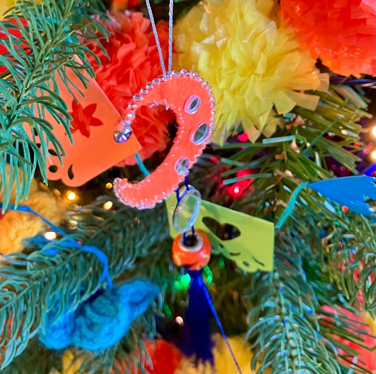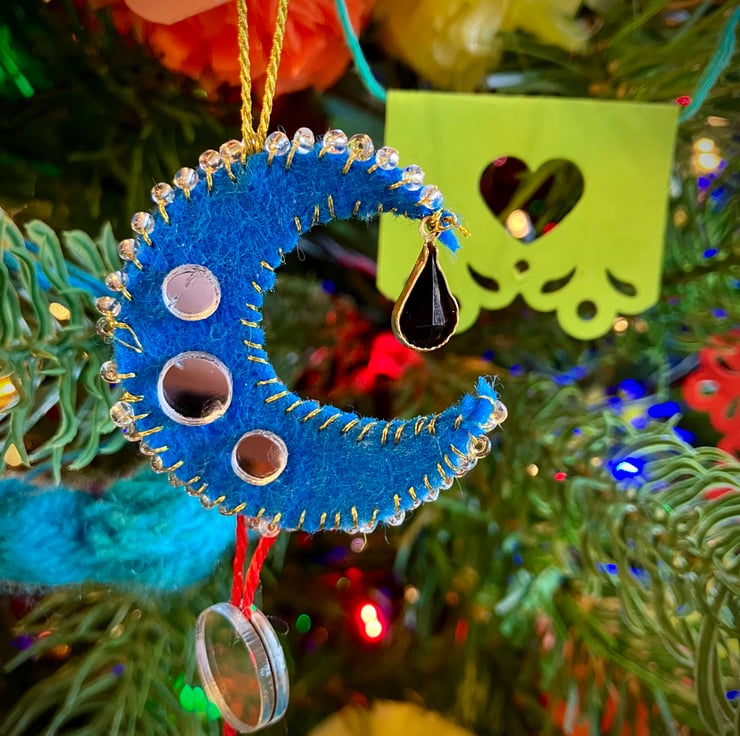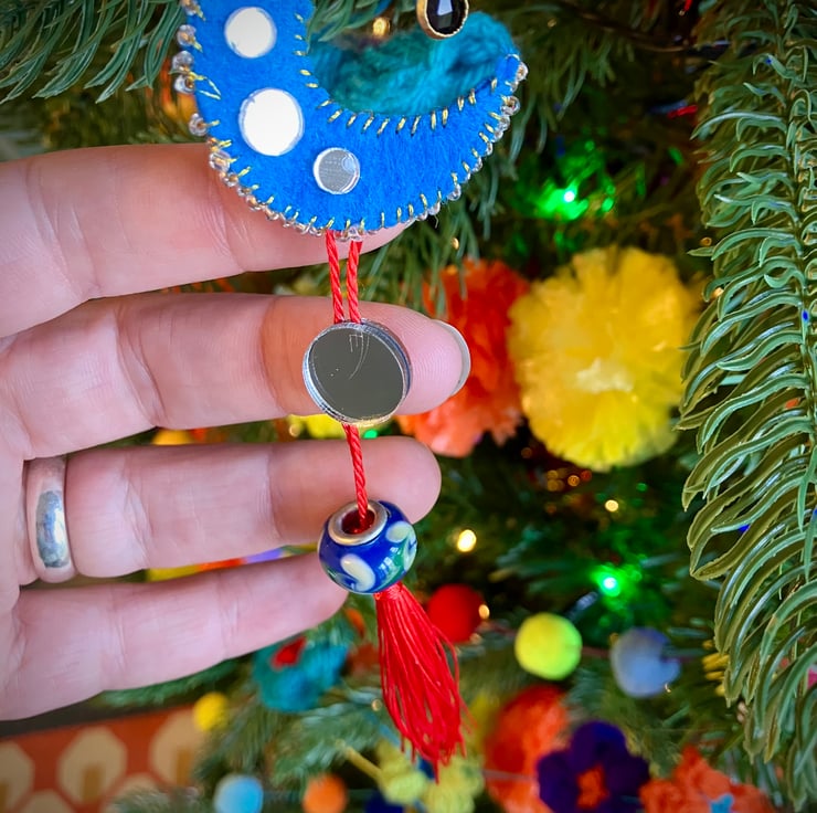 Bring a little moonlight magic to your tree or home with this handmade felt moon decoration. Each crescent moon is crafted from soft felt in bright, joyful colours, and hand-embellished with tiny mirrors and beads that shimmer beautifully when they catch the light.
