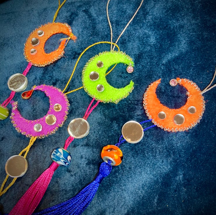 The moon hangs from a silver or gold cord and is finished with a tactile drop of glass beads and a silky tassel, giving it a celestial sparkle that sways gently when hung. Each one is unique — a small stitched celebration of colour, craft and curiosity.