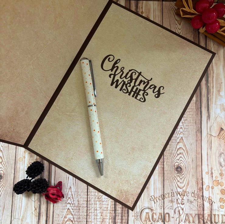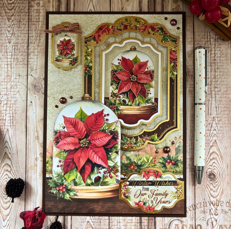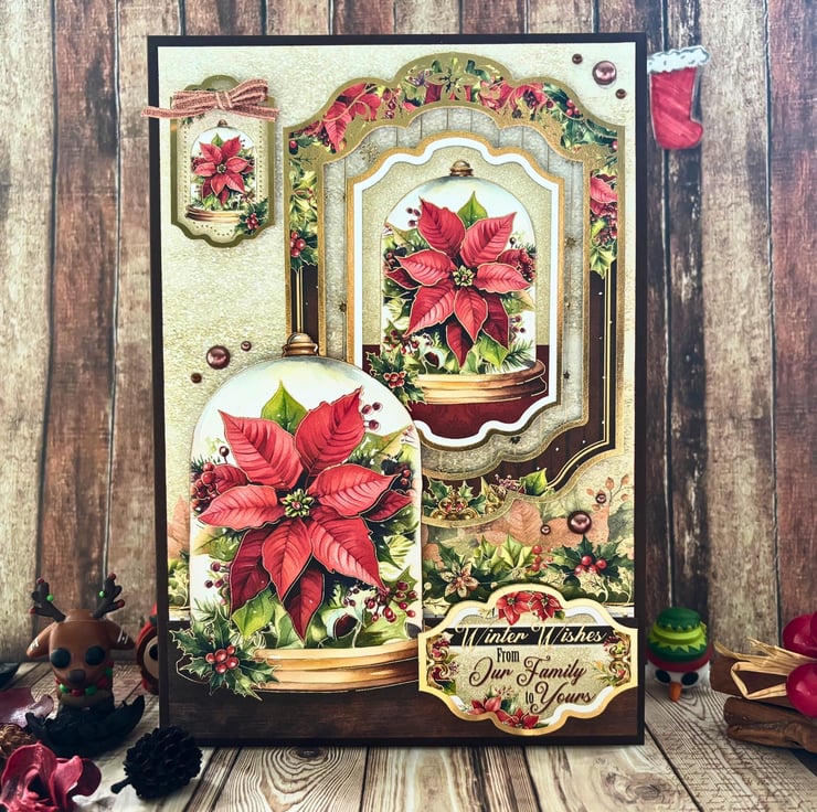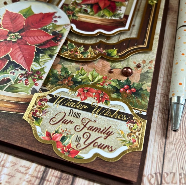Made with a brown card base, it is layered with printed cardstock and gold foiled toppers, with the image of a red poinsettia in a flower dome. A small tag on the top left is embellished with a matching ribbon bow, while the raised panel at the bottom accommodates the sentiment "Winter Wishes From Our Family To Yours". Finished on the front with metallic bronze pearls. The card is also decorated inside, with matching, vintage style card and the sentiment "Christmas Wishes" cut out of brown card.