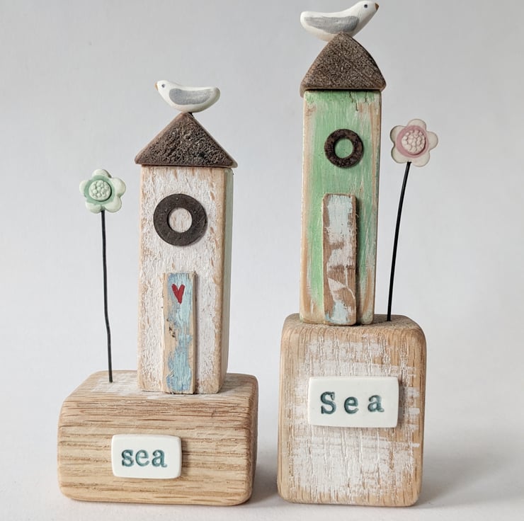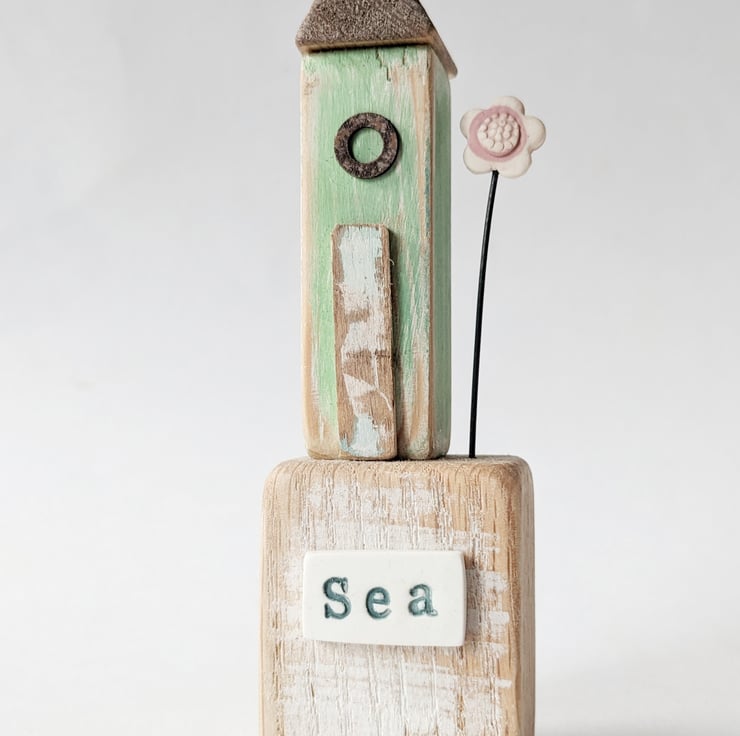 This is one of my tiny little rustic sea huts with a porthole window, a happy flower, and a hand stamped base.