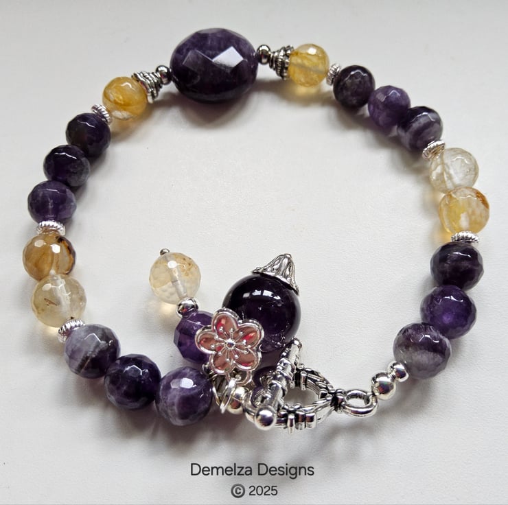 For the main construction professional coated stainless steel jewellers wire has been used for added strength, finished off with a decorative heart shaped toggle style clasp. At one end is a larger 12mm amethyst bead, 7mm faceted amethyst and rutilated quartz gemstone complimented with a silver plated flower charm.