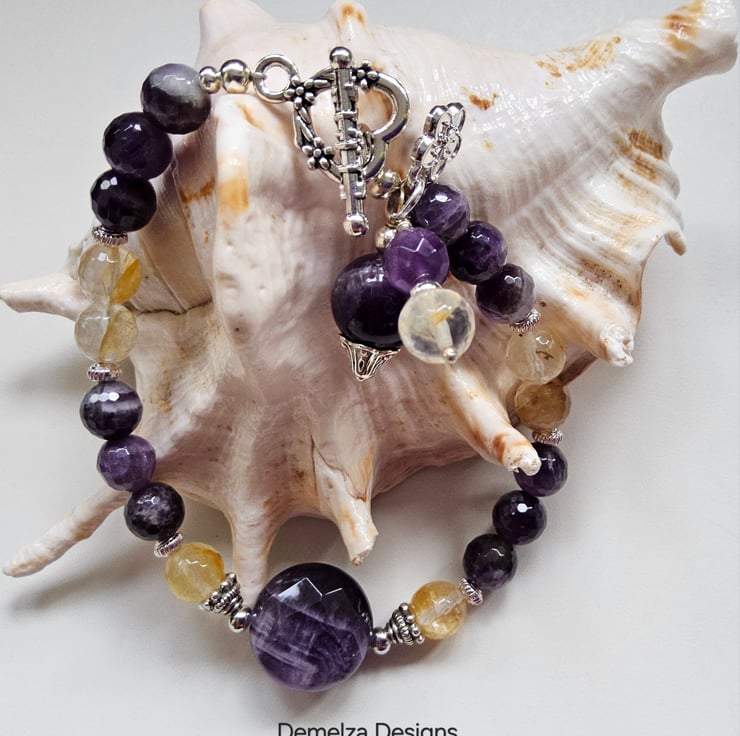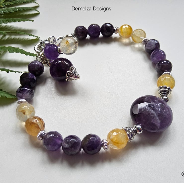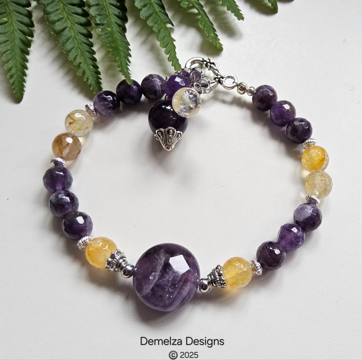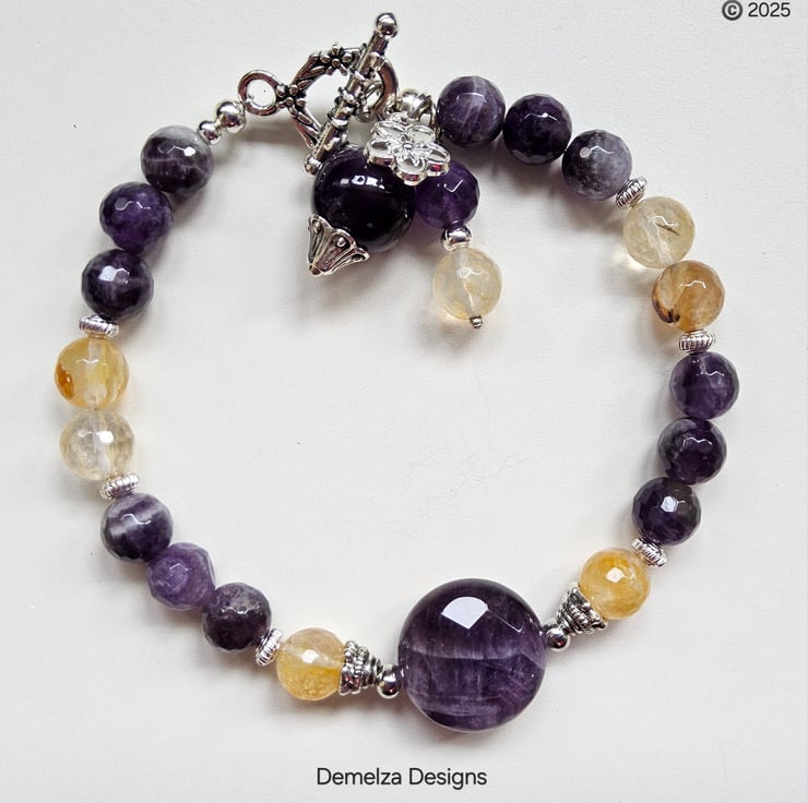 Following on are 7mm faceted amethyst and rutilated yellow quartz beads. Within the design are silver plated decorative 4mm roundel spacer beads.