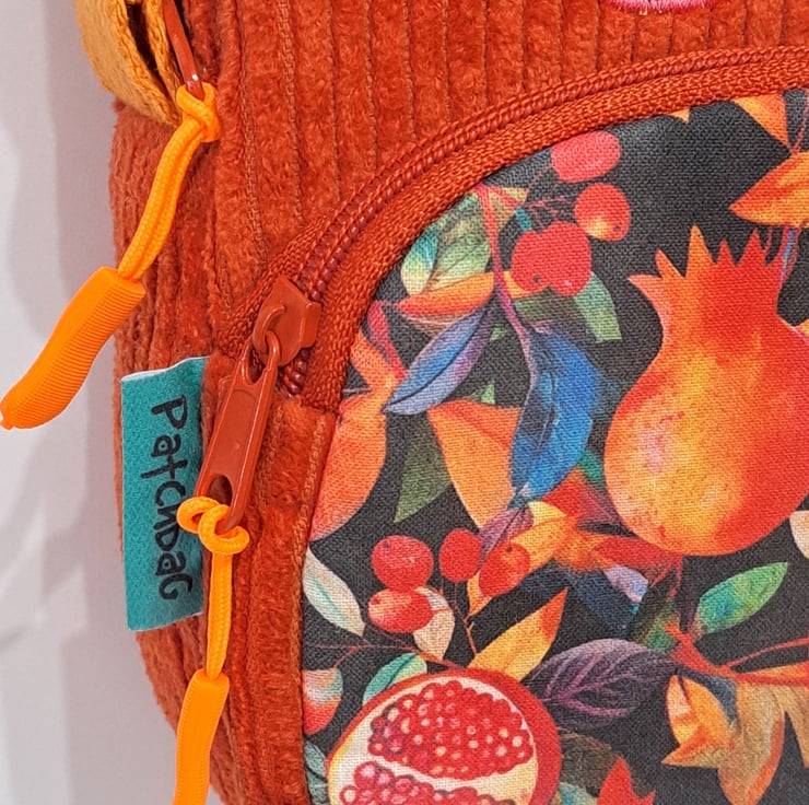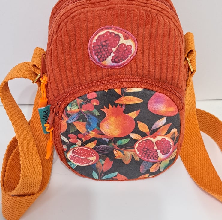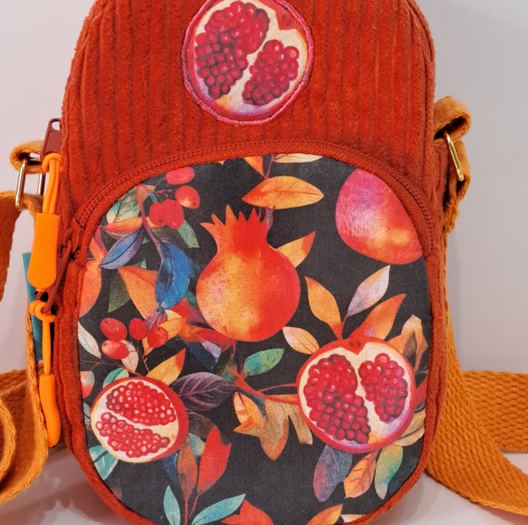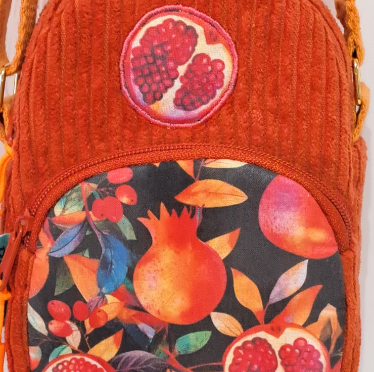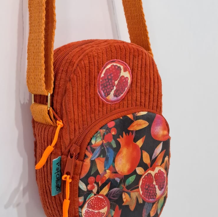 Beautiful handmade burnt orange corduroy mini bag for essentials as mobile phone, keys and other essentials. The mini shoulder bag decorated with pomegranate patterned fabric and applique pomegranate. The colors are wonderful autumn colors. The pattern also contains autumn berries and leaves. The bag closing with zip on the top and has front pocket also with zip closure. The shoulder strap is adjustable with golden metal clasps, maximum length approximately 128cm(50 1/2"). This little bag ideal for holidays, you can put in your passport, keys, etc. The dimensions of the bag are the following: hight 20cm (8"),width 13cm (5"),depth 5cm (2"),front pocket depth 2cm(3/4"). The lining of the bag made from waterproof fabric.