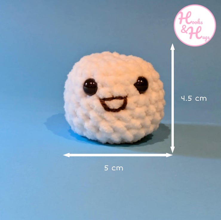 A cute handmade crochet marshmallow, with a happy expression. The marshmallow is made of snuggly soft white polyester wool, and stuffed with regular toy stuffing for a satisfying squish.