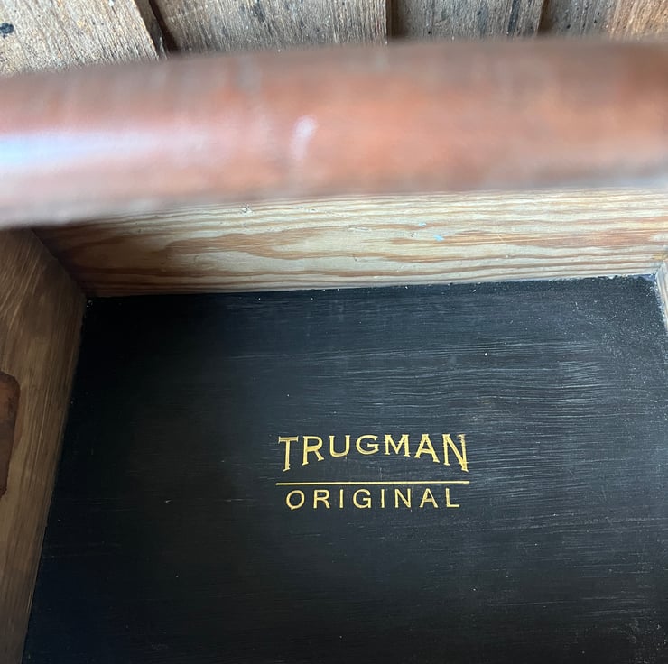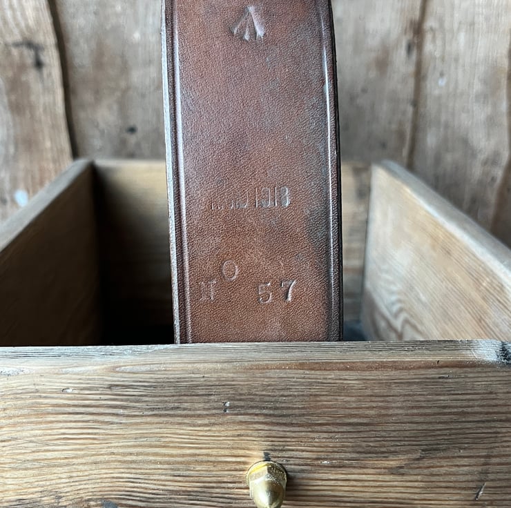 Made from old pine shelving, salvaged and preserved to a rich patina. 13”x9”x5 1/2”. it’s as solid and rugged as Ilkley Moor. And the leather handle and brass fittings add the final touch.