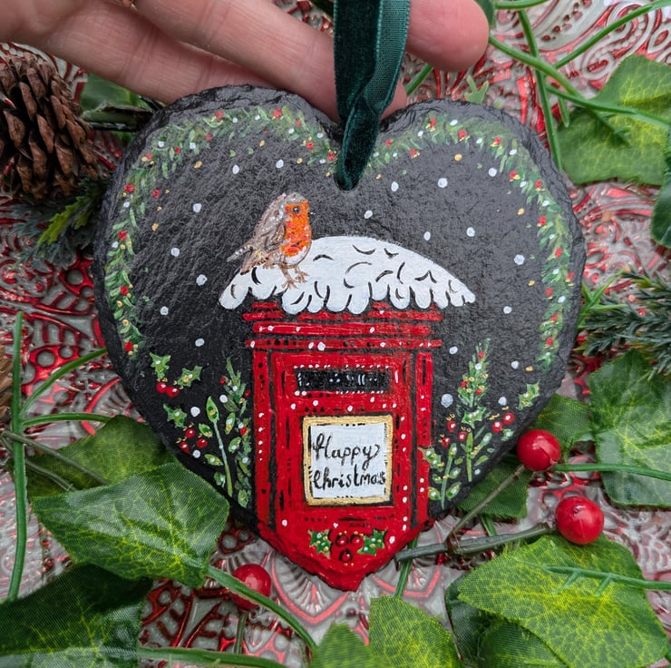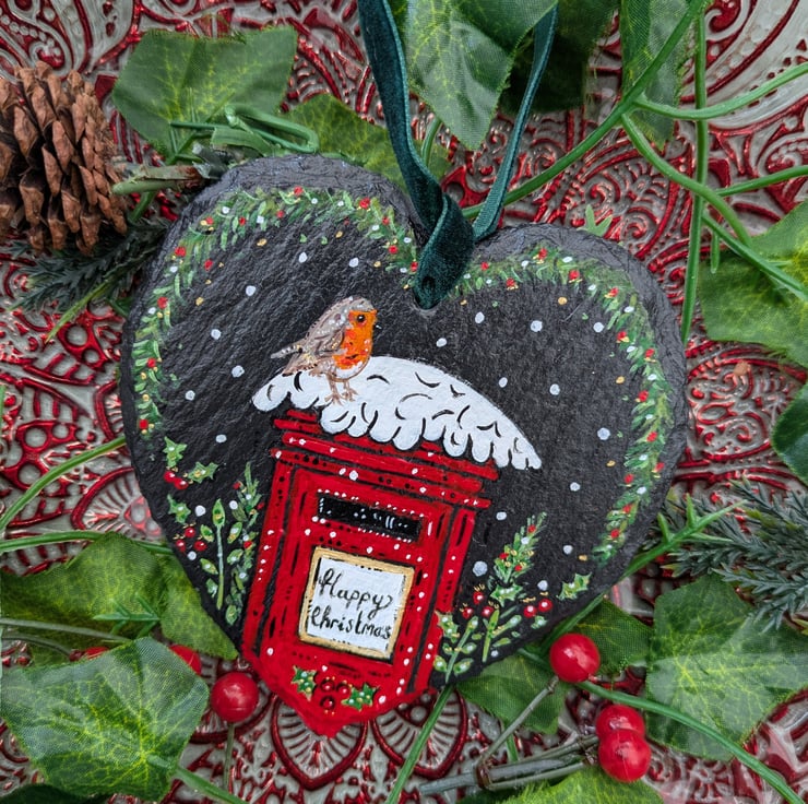 A beautiful hand-painted Robin and post box slate heart ornament. Painted in acrylics and gloss varnished. The heart is approx 11cm and comes ready to hang with green velvet ribbon.
