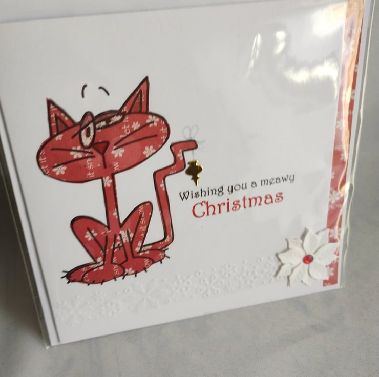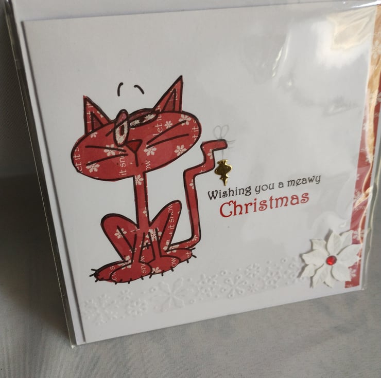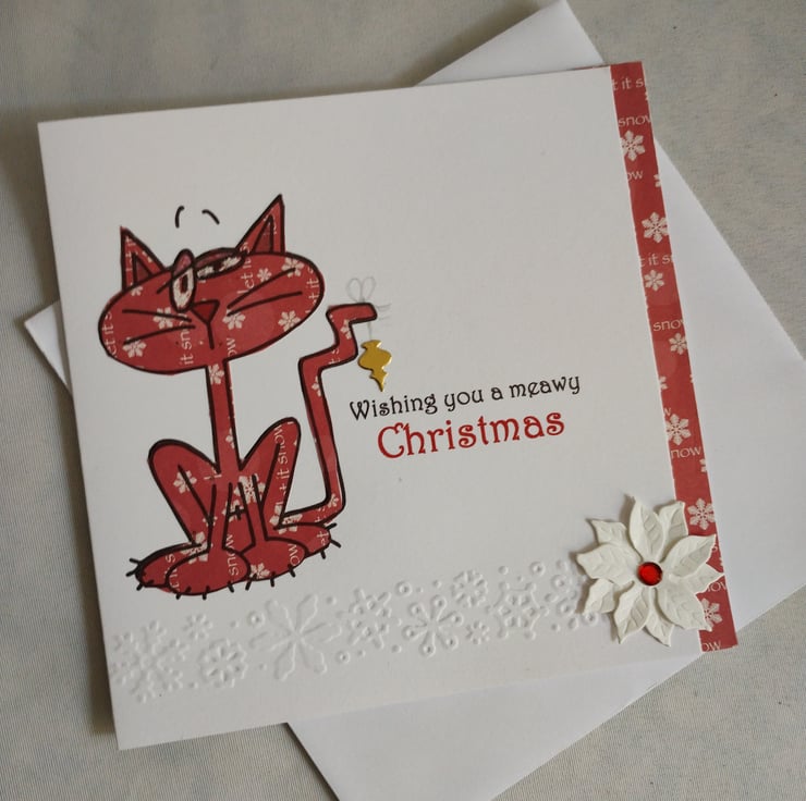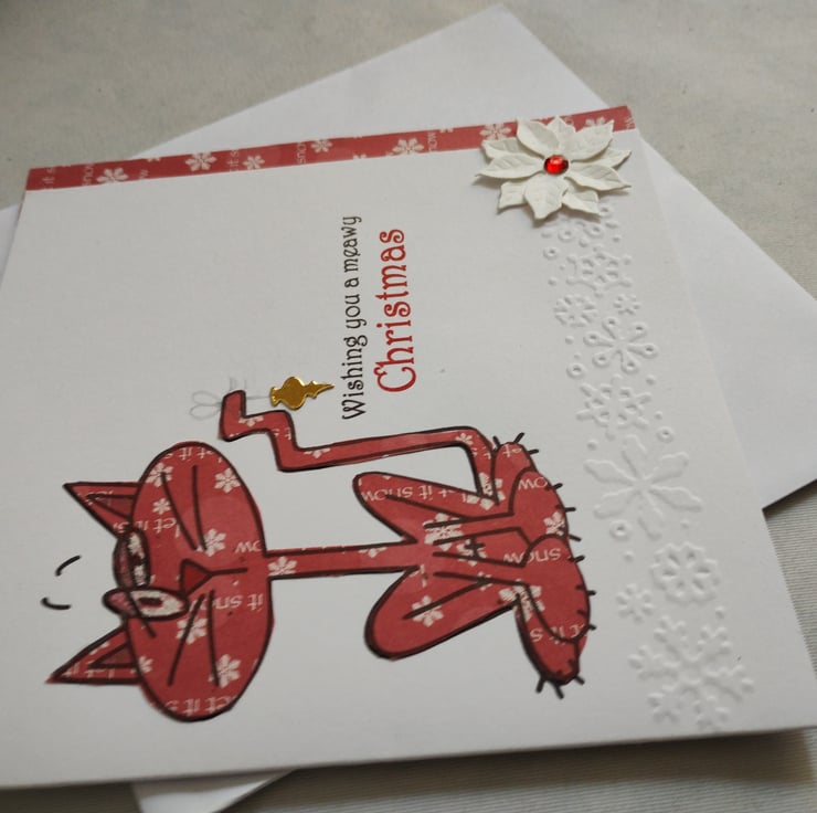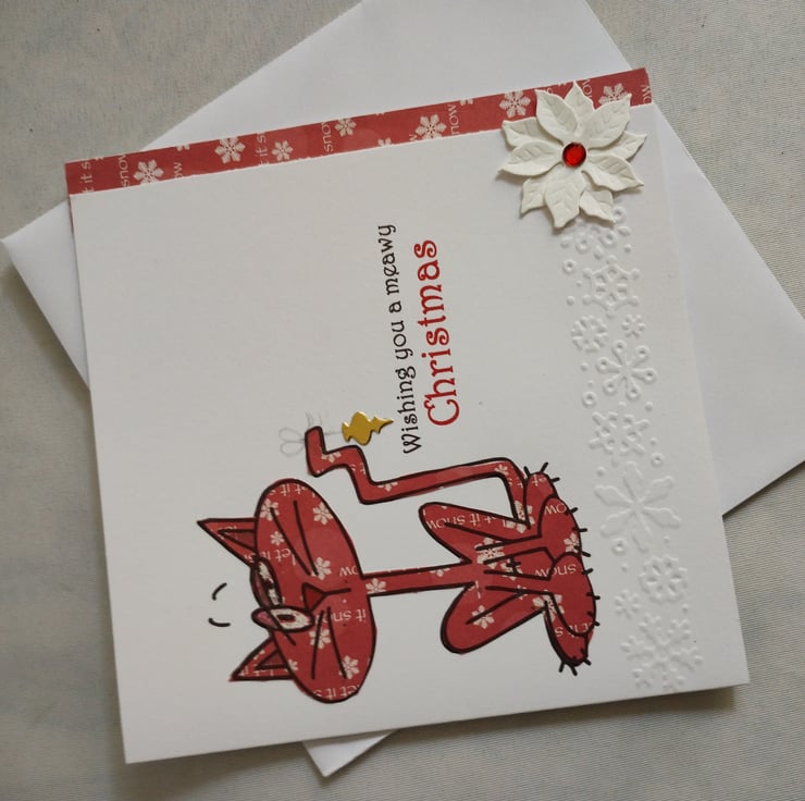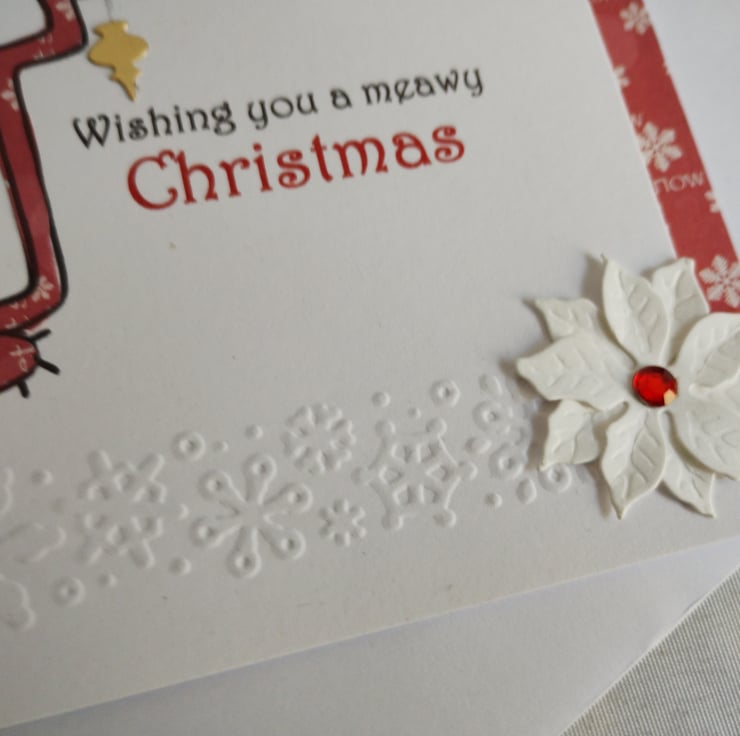 I've designed and printed elements of this Christmas card and then paper pieced the cat in a lovely red with snowflakes patterned paper. I've cut a tiny bauble to hang from the cat's tail in shiny gold mirri-card. I've cut a white poinsettia and added a sparkly red gemstone for the centre of the flower. Along the bottom I've embossed a strip of snowflakes and added a strip of the patterned paper to the inside edge of the card.