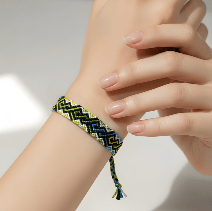 Add a splash of colour and craftsmanship to your wrist with this handmade woven friendship bracelet, featuring a striking chevron zigzag pattern in vibrant shades of green, blue, black, yellow, and white. Carefully crafted using high-quality embroidery floss, this bracelet combines bold geometry with boho charm — perfect for festivals, everyday wear, or as a heartfelt gift.