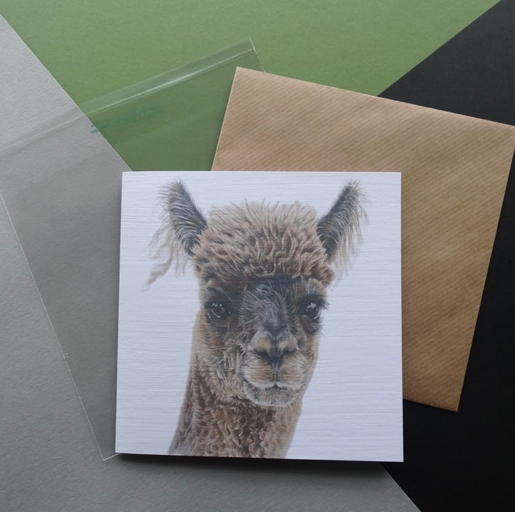Share a smile with this charming alpaca art card, printed from my original coloured pencil drawing of the alpaca, who I affectionately named "Elvis"