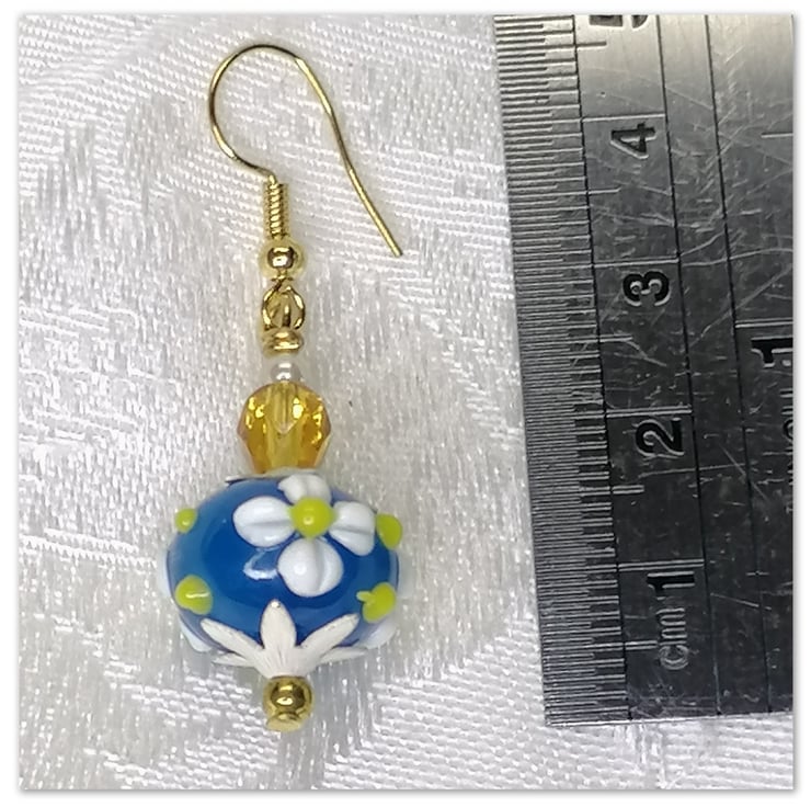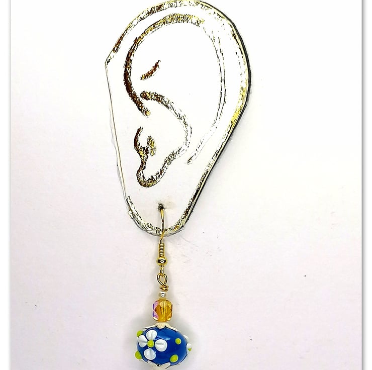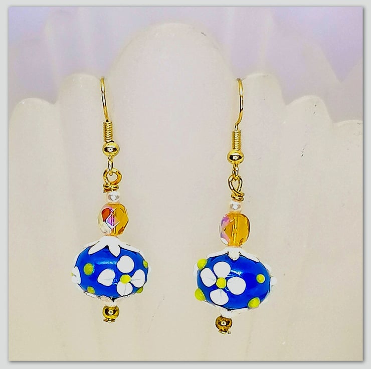 Elegant handmade Gold-plated earrings with Venetian Murano blue glass flower beads and amber coloured crystal beads.