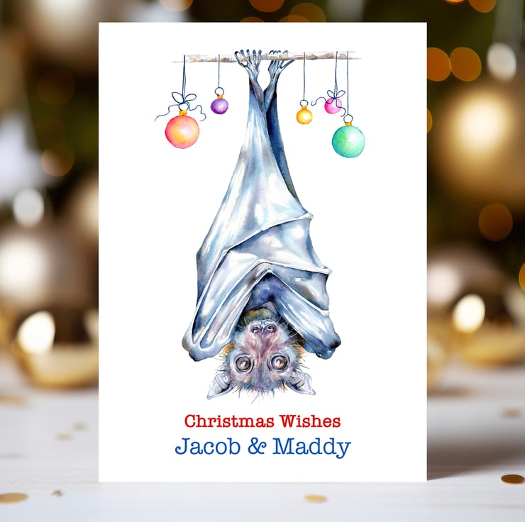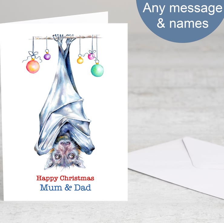 Personalised Flying Fox Christmas card. Choose from one of my messages, or add your own.