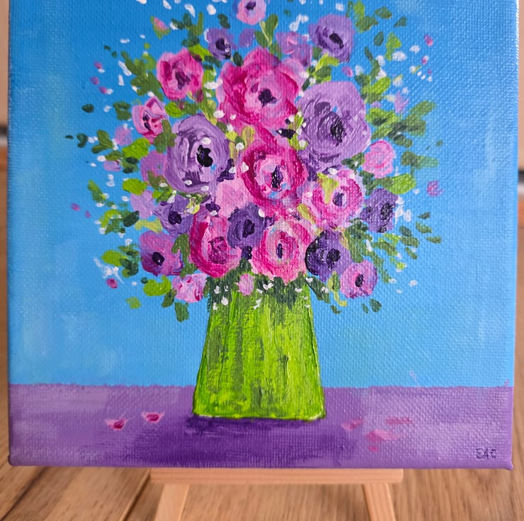 'Roses Forever Bouquet' is an original acrylic painting on a mini canvas measuring 15x15cm. It stands on a small wooden display easel, which is included in the price.