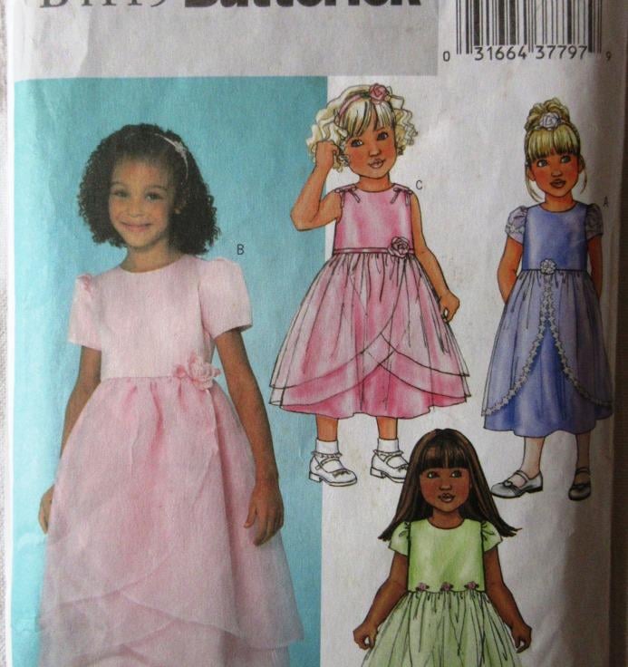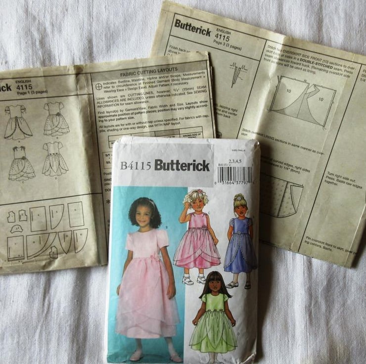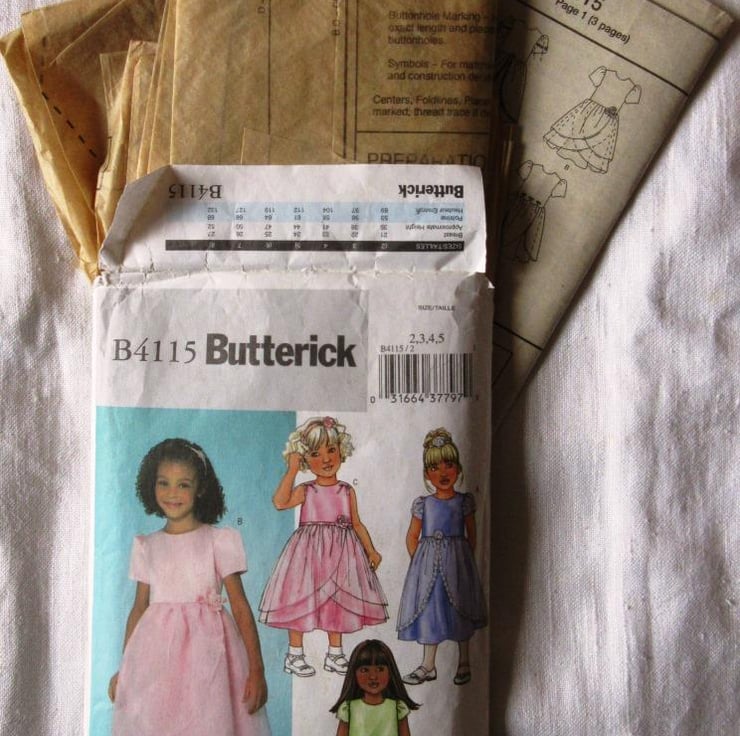 A sewing pattern for a little girl's bridesmaid's dress with overskirt in size 2 (chest 21"/53 cm, Butterick B4115). The little girl's dress has fitted bodice and short sleeves. The dress is mid-calf length with back zipper and overskirt variations. View C is sleeveless. View D has scalloped-edged overbodice. PLEASE NOTE: the pattern was originally a multi-size pattern, but it has been used to make view A in a sleeveless version in size 2. Several of the pattern pieces are uncut, including the other overskirt variations, but since the basic bodice and skirt have been cut for size 2, effectively only size 2 is still useable. The pattern is dated 2004.