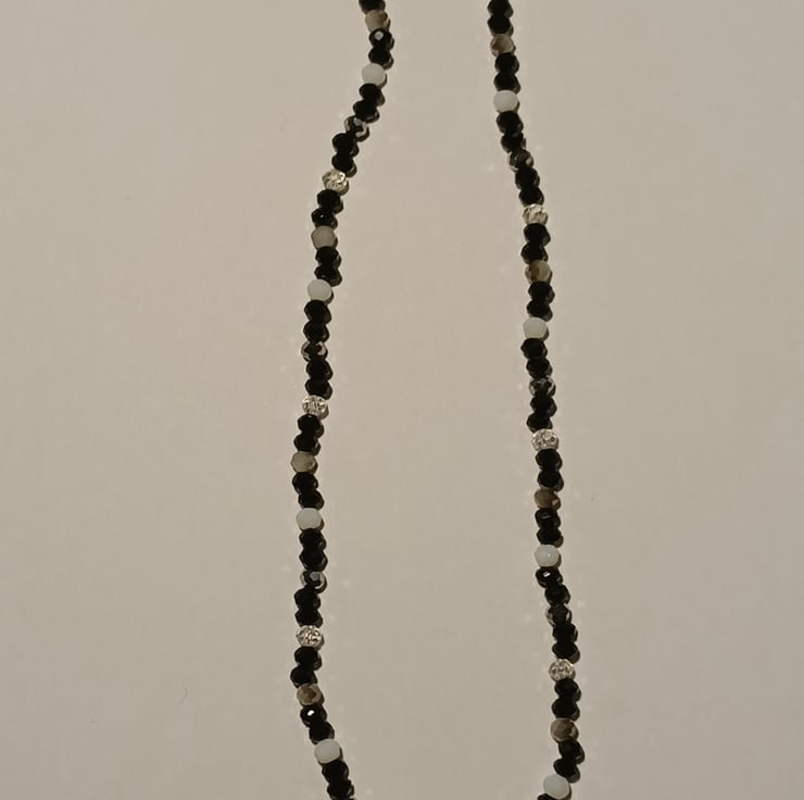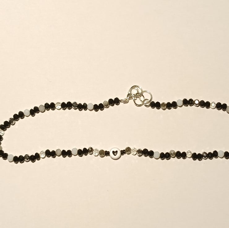 This unique piece consists of one 10mm round white bead with a black heart design as the centre piece. Next to the heart are 1mm black glass beads , 4mm two-toned silver and grey crystal beads, 4mm clear transparent beads , 4mm silver metallic crystal beads, 4mm black crystal beads and 4mm white crystal beads .
