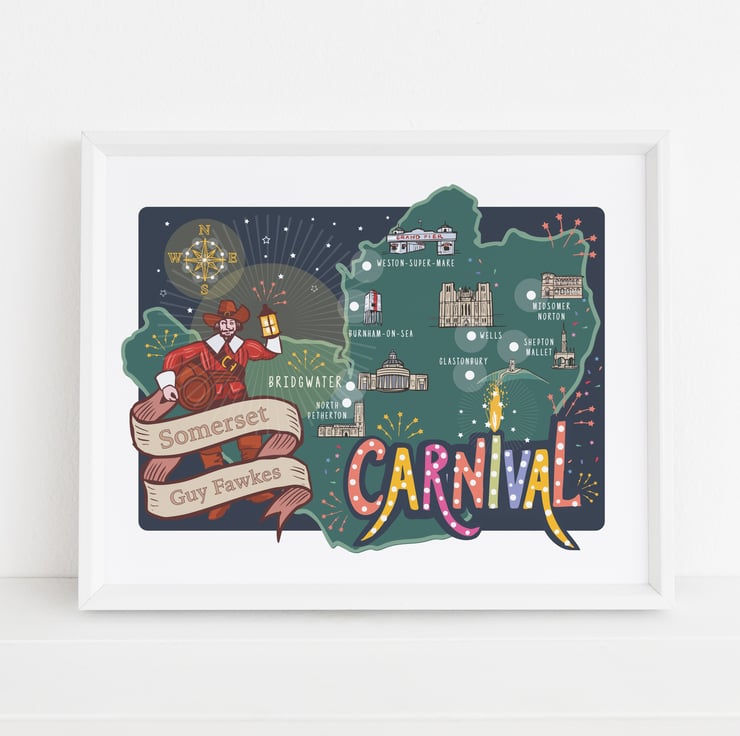 Originally created as a special edition illustration wall art print to sell at a local gift shop in the centre of my hometown. This Somerset Guy Fawkes Carnival map celebrates a 400 year old tradition that lights ups the skies across Somerset throughout November each year.