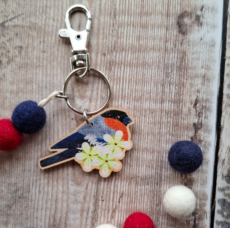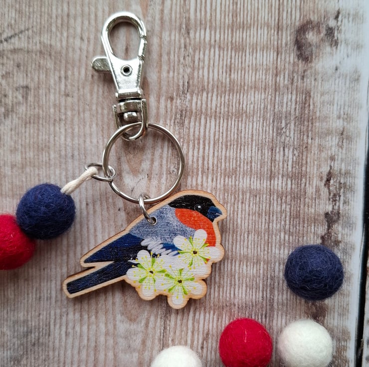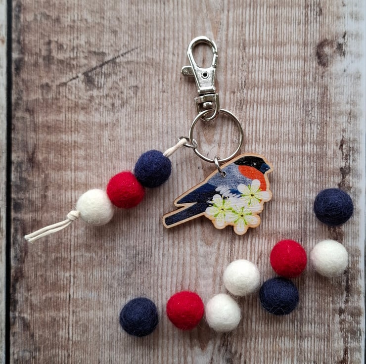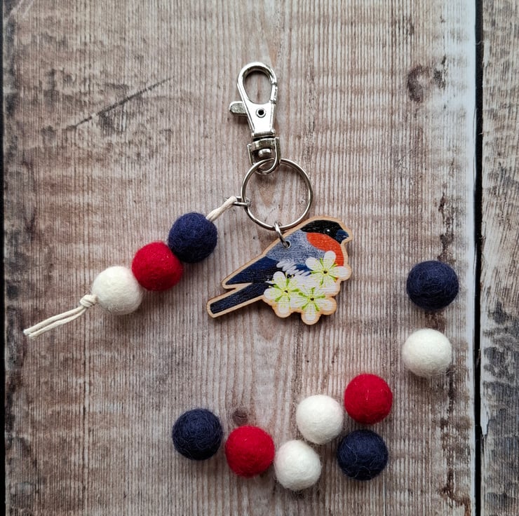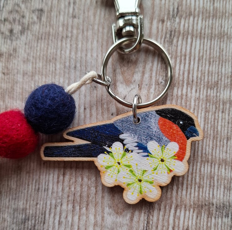 A 50mm wooden charm illustrated with an original design of a bullfinch by Daffodowndilly. Accompanied by a themed colour 3 felt ball charm and complete with a large lobster swivel clasp and split ring to attach to your bag or keys.
