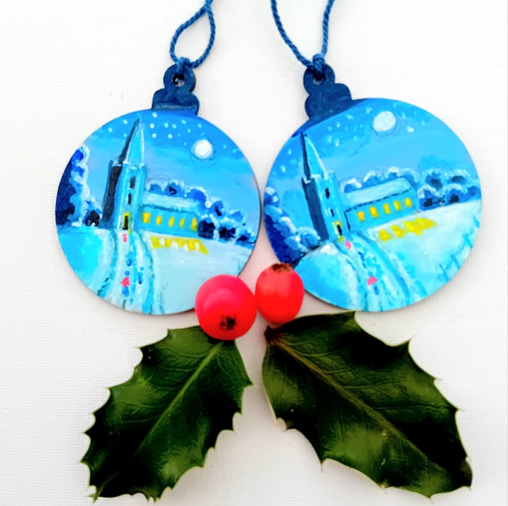 2 pretty hand painted baubles showing people heading gorgeous midnight mass. Ready to hang. UK only delivery