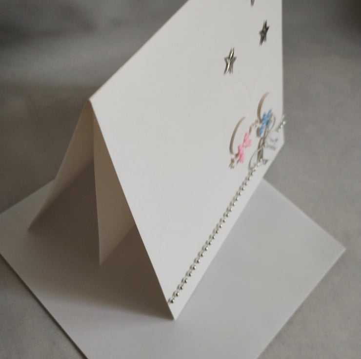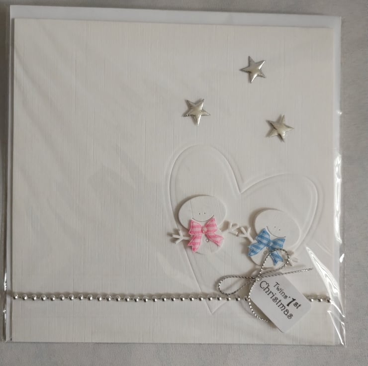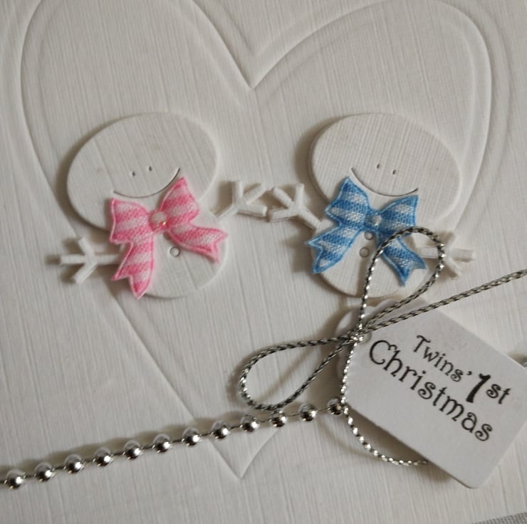I've made this card from beautiful linen textured cardstock. It features two tiny snowmen within an embossed heart. One snowman has a pink gingham bow the other a blue gingham bow. I've cut and stacked the snowmen numerous times to add depth. I've added a string of tiny silver balls along the bottom and added the tag with a silver bow. I've added three puffy silver stars to balance the design.