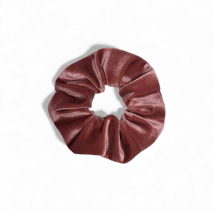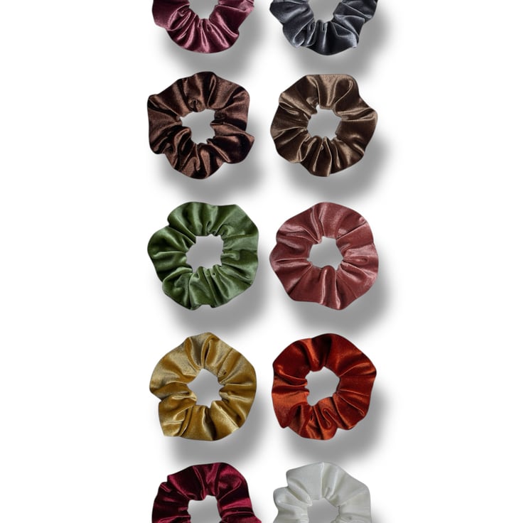 Set of 10 velvet scrunchies in Grape, Grey, Chocolate, Mocha, Apple Green, Rose Pink, Mustard, Burnt Orange, Wine & Ivory, handmade by me.