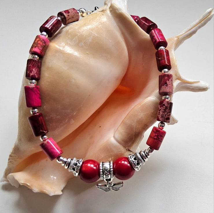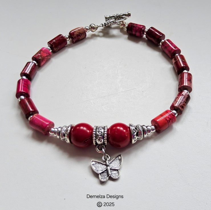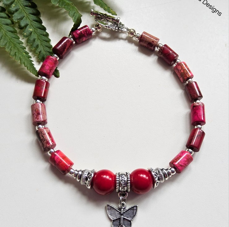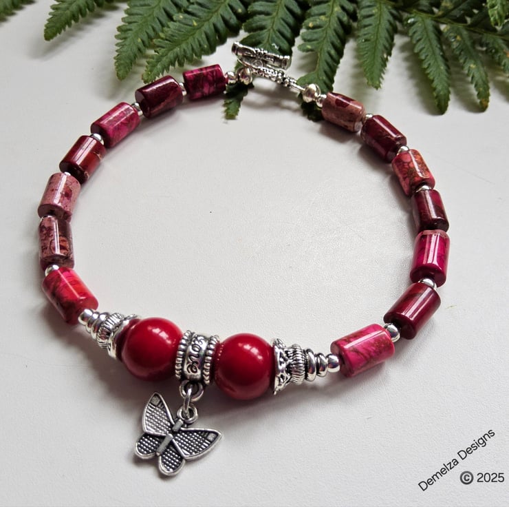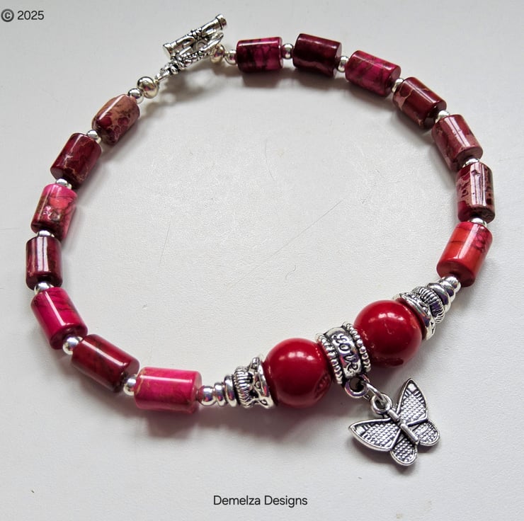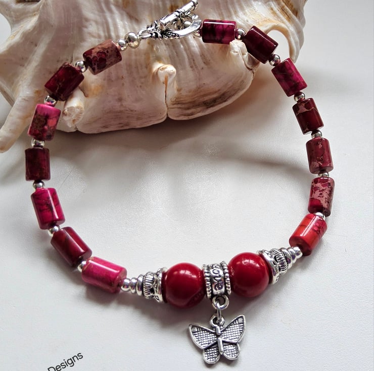 This lovely coral and imperial jasper butterfly bracelet has been designed and hand crafted in Cornwall by Demelza Designs for those seeking total individuality to either gift or wear themselves.