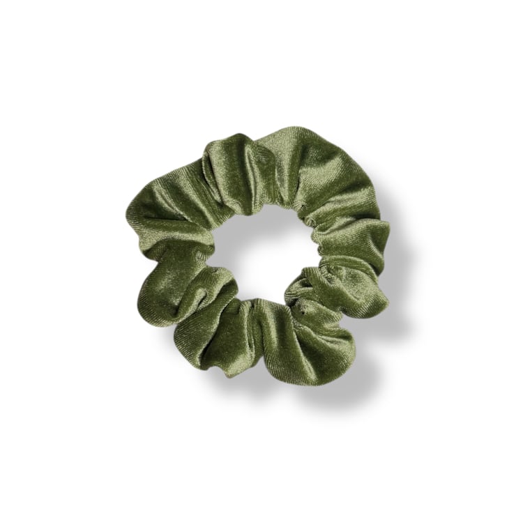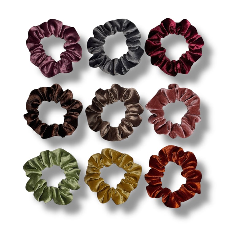 Set of 9 velvet scrunchies in Grape, Grey, Chocolate, Mocha, Apple Green, Rose Pink, Mustard, Burnt Orange & Wine, handmade by me.