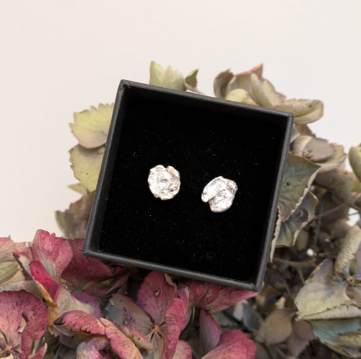 A unique pair of sterling silver water cast earrings with stud backs. Made by dropping molten silver into cold water, to capture the shape as it hits the water.