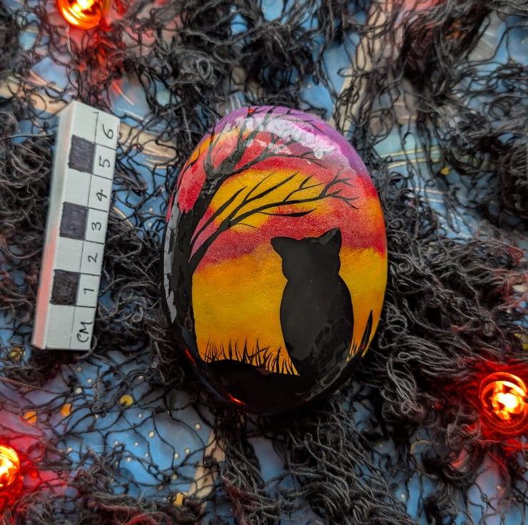 A natural stone hand painted with acrylics and glitter paint. sealed all over with resin for a glossy finish.
