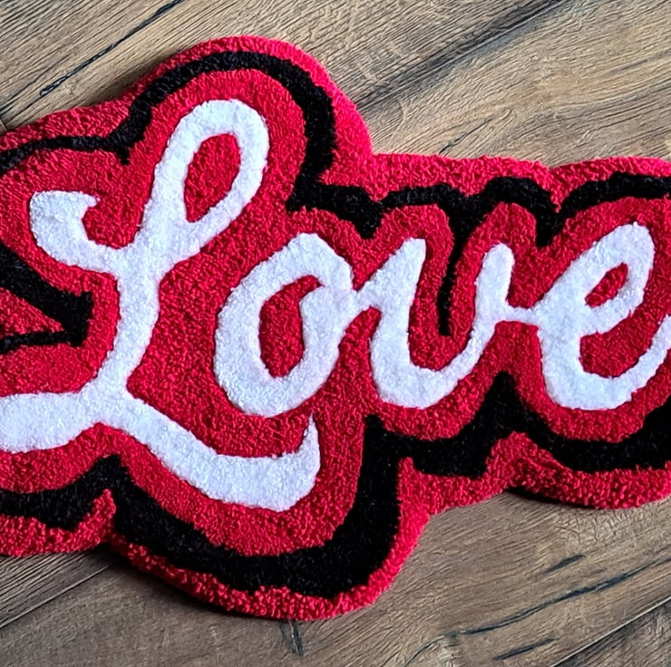 This beautiful handmade cut pile tufted rug, made from good quality acrylic yarn, is a small 'Love' design, measuring 44 x 34 cm, perfect for adding a pop of colour and charm to your space. it is not only stylish, but striking, in a red and black design with the word "Love" prominently displayed in white text. Finished with a non slip backing, the intricate cut pile creates a luxurious feel underfoot, making it a cosy and comfortable addition to your living space. Ideal for creating a focal point in your bedroom, lounge, or dining area, this rug is a unique and eye-catching piece which combines style with warmth, making it a delightful addition to your home.