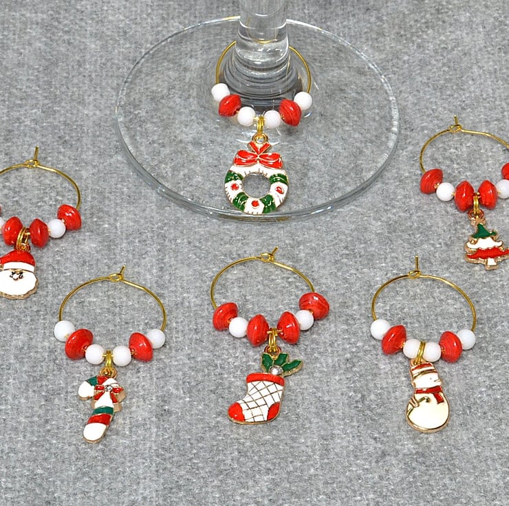 A cute and fun way to keep everyone’s wine glasses in order over the festive period. Your guests can pick from Santa, A Festive Christmas Wreath, Candy Cane, Christmas Stocking, Christmas Tree, or Snowman as their charm of choice. The charms are set on 2.5cm diameter gold-coloured rings with a pin and loop fastening, and flanked by red and white glass beads.