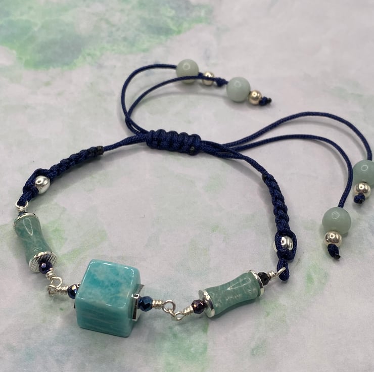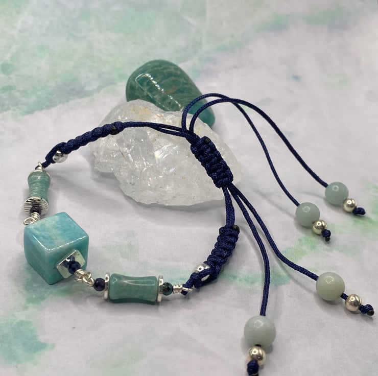 A macrame cord slider bracelet with a central 10mm amazonite cube. It's surrounded by two amazonite bamboo shaped stones with silver plated heishi beads and shimmering blue coated faceted spinel stones at each end. The navy cord slider ends are finished with 6mm amazonite beads and silver plated round spacers.