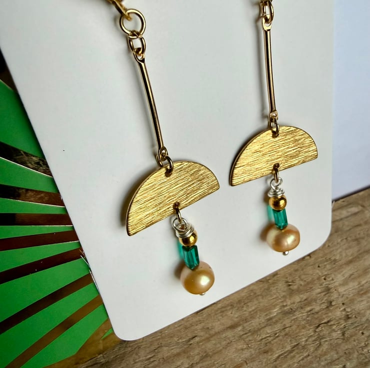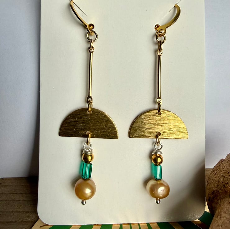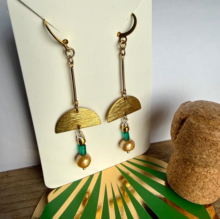 Unique handmade earrings with an Art Deco vibe. Ideal festive.. going somewhere special.. party time.. gift for someone.. or just because you love them earrings!! Elegant but understated these one of a kind pieces have a beautiful champagne coloured freshwater pearl, and green crystal cut glass tube bead.. both looking lovely with the added gold accents. If you like a longer drop then these are ideal. Gold plated lever back fitting.