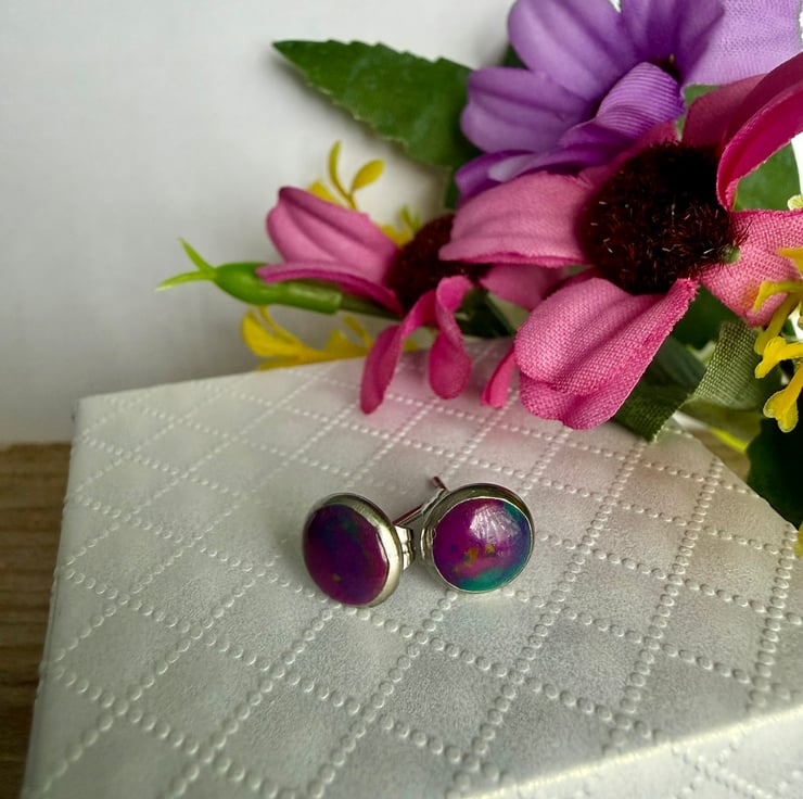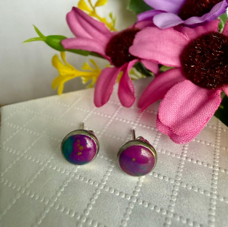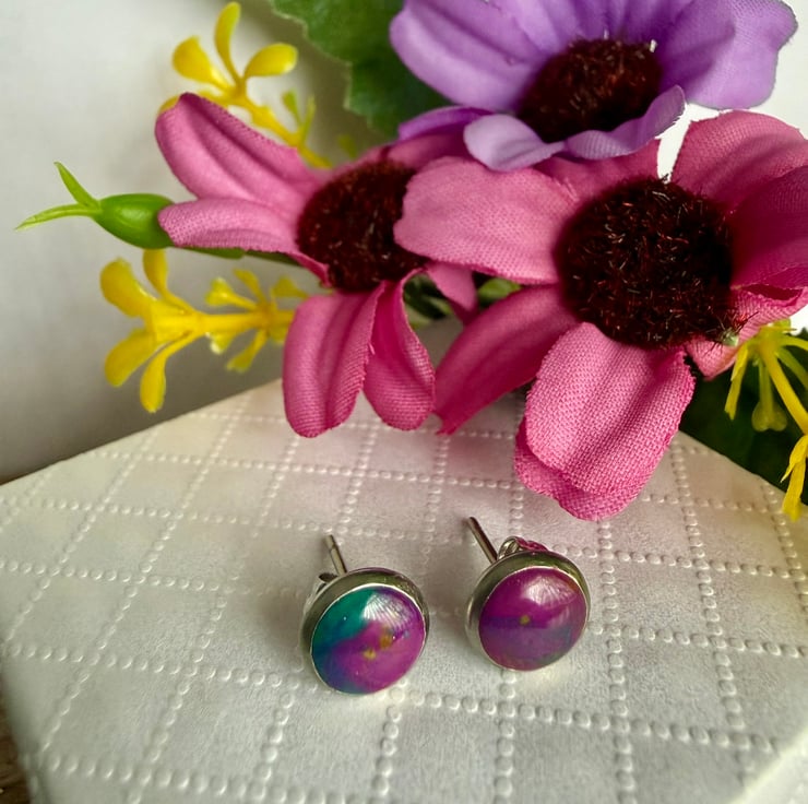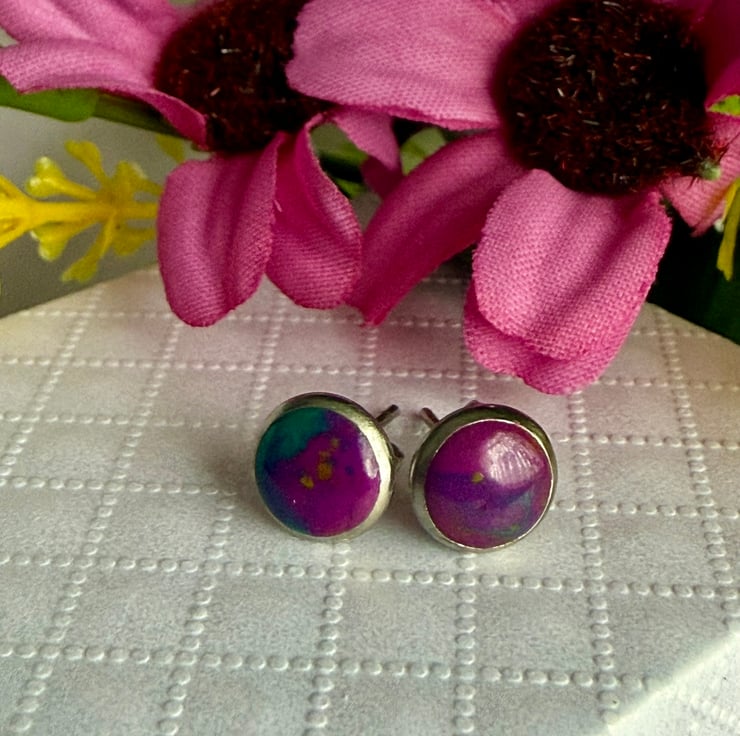 For those who like a petite stud earring. These Stainless steel one of a kind handmade polymer clay earrings are ideal. All hand mixed colours in various tones of purple.. pink.. green and mustard. The earrings are lightweight for those who do not like anything heavy.