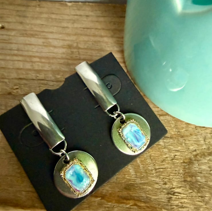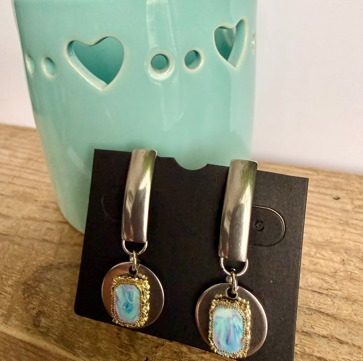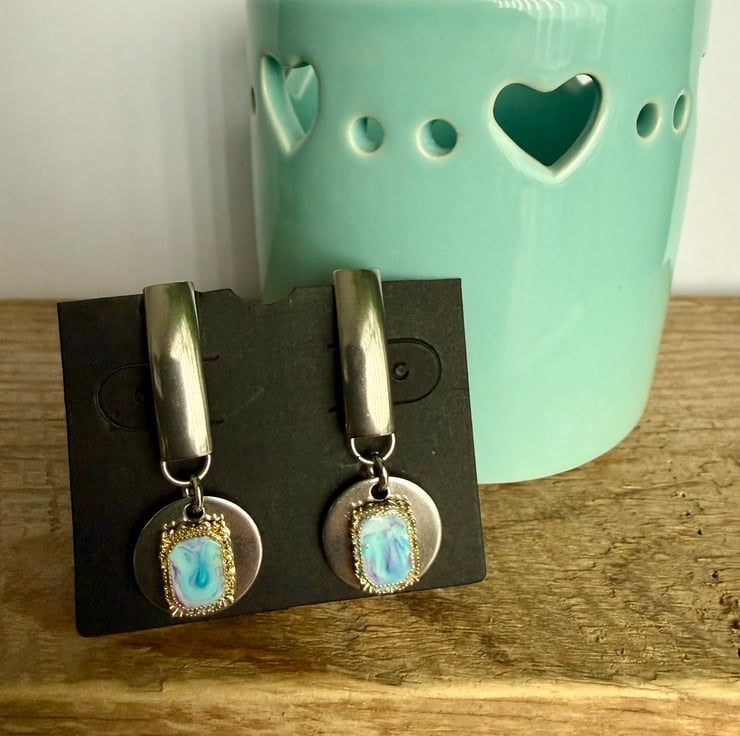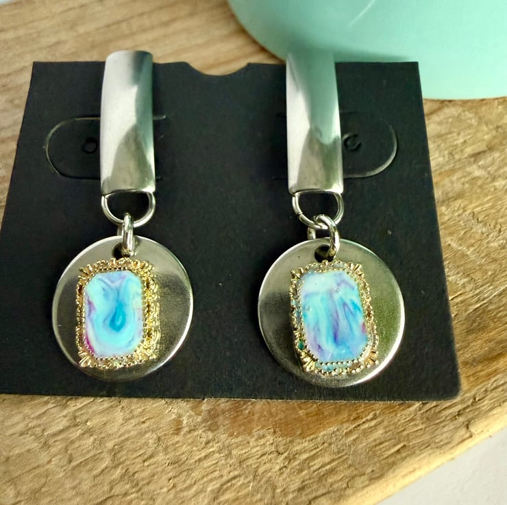 Beautiful One of a kind earrings. Taking a gold coloured metal filigree rectangle I added self mixed polymer clay in shades of purple, pink and blue.. this was then attached to a Stainless Steel disc before hanging on a rectangle Stainless Steel stud fitting. These earrings are ideal to be worn dressed up or down.