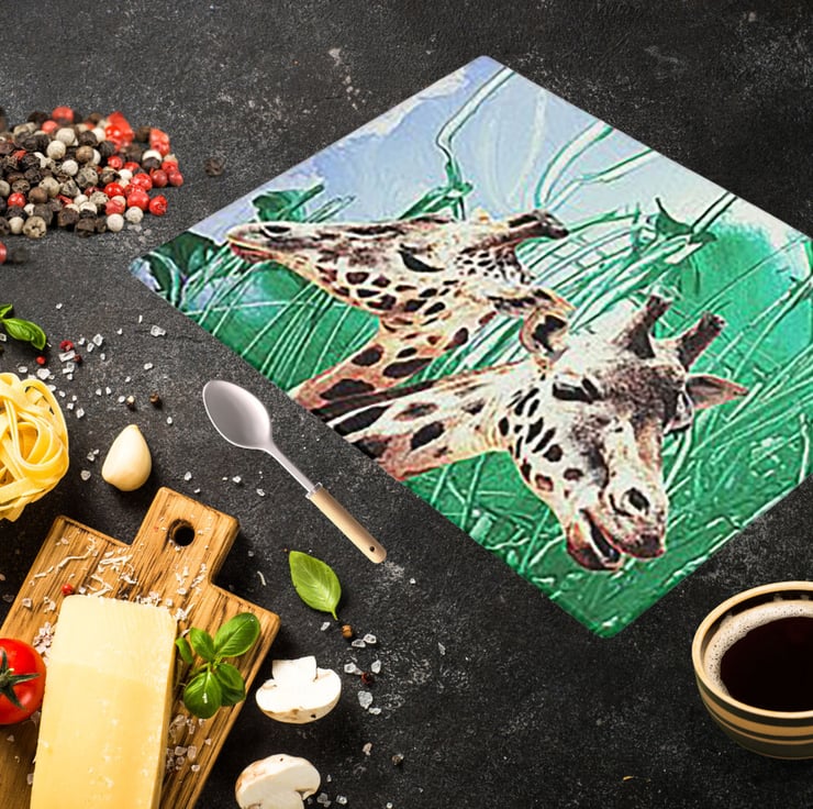 Add a splash of exotic elegance to your kitchen with our Giraffes Amid Green Foliage Glass Chopping Board from A Touch Of Glass. Featuring original artwork of graceful giraffes surrounded by lush tropical greenery, this design brings a fresh, contemporary jungle vibe to your home.